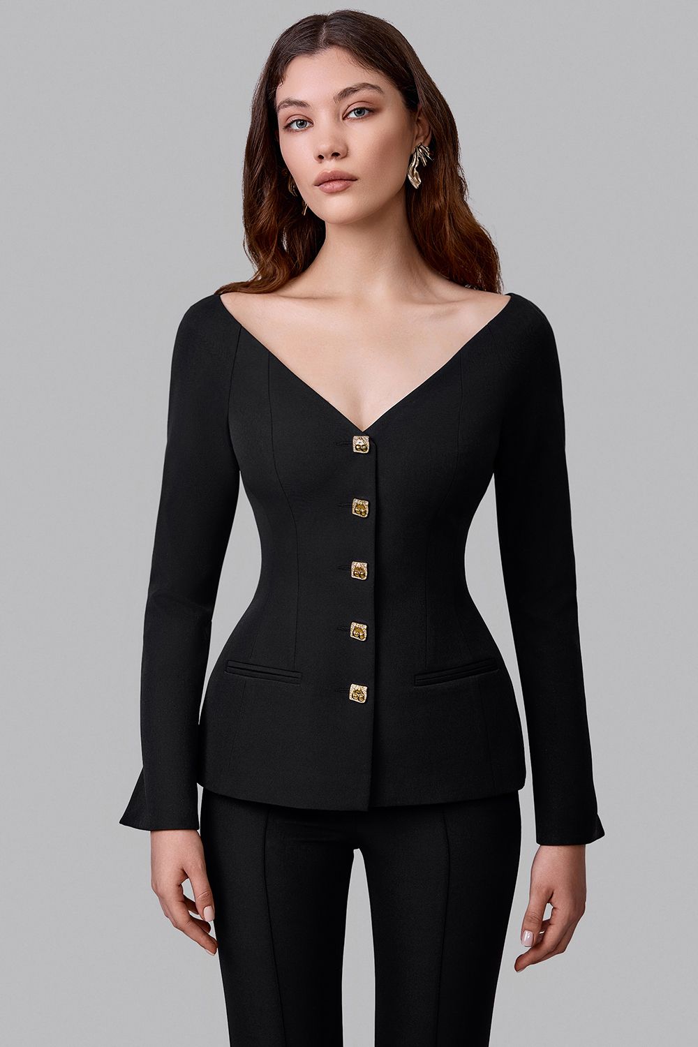 Приталенный жакет с глубоким V-декольте подчеркивает силуэт и создает элегантный, собранный образ. Четкая линия плеч и мягкое прилегание формируют выразительную архитектуру модели. Декоративные пуговицы добавляют акцент и визуально вытягивают силуэт. Длинные рукава и лаконичный крой делают жакет универсальным решением для дневных и вечерних образов. Идеален как самостоятельный элемент или в комплекте. Состав: 72% полиэстер, 23% вискоза, 5% эластан, Подклад 95% полиэстер, 5% эластан