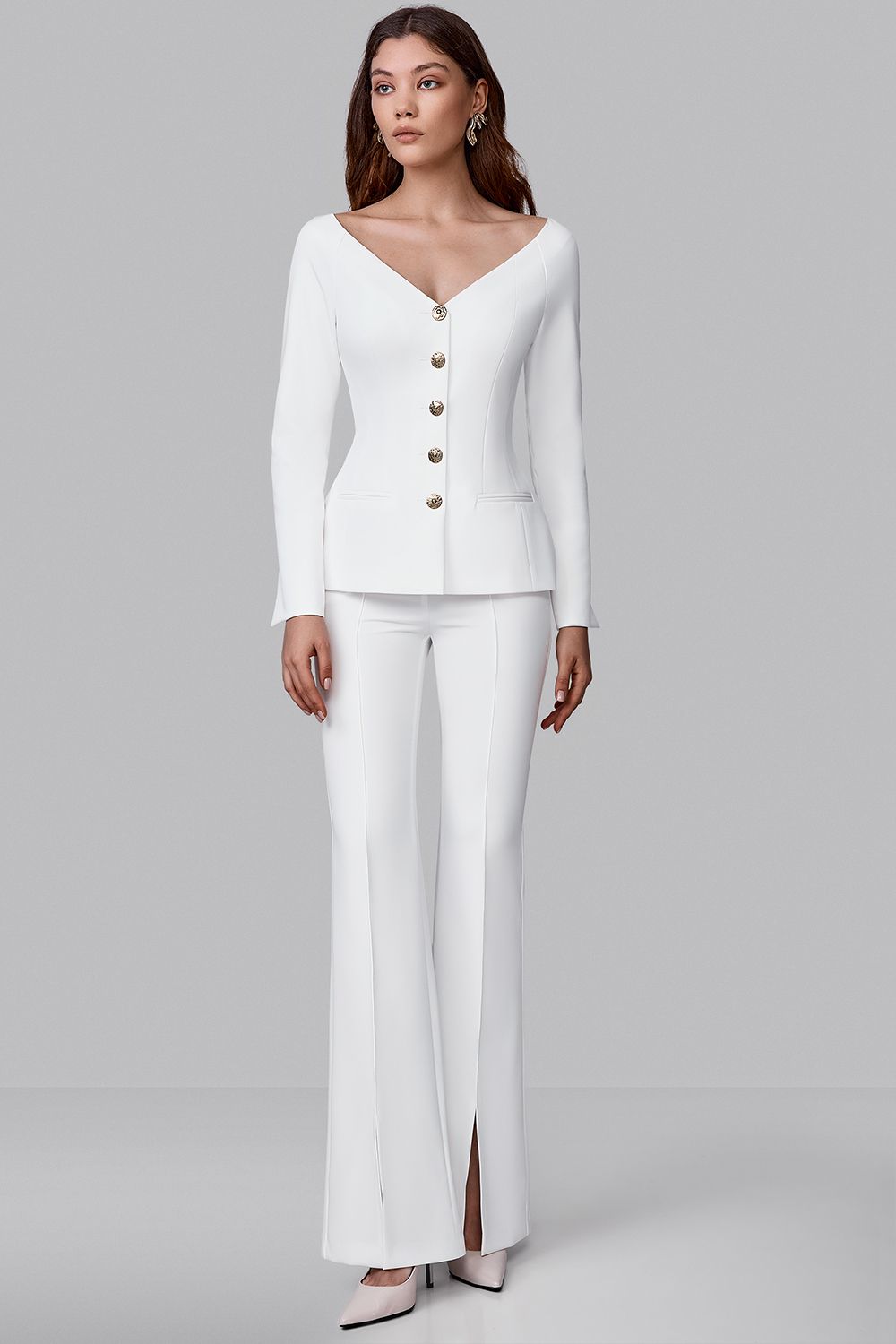 Жакет приталенного силуэта с акцентом на открытую линию плеч. Раскрытая зона декольте подчёркивает шею и ключицы. Декоративные металлические пуговицы добавляют выразительный акцент. Состав: 72% полиэстер, 23% вискоза, 5% эластан, Подклад 95% полиэстер, 5% эластан