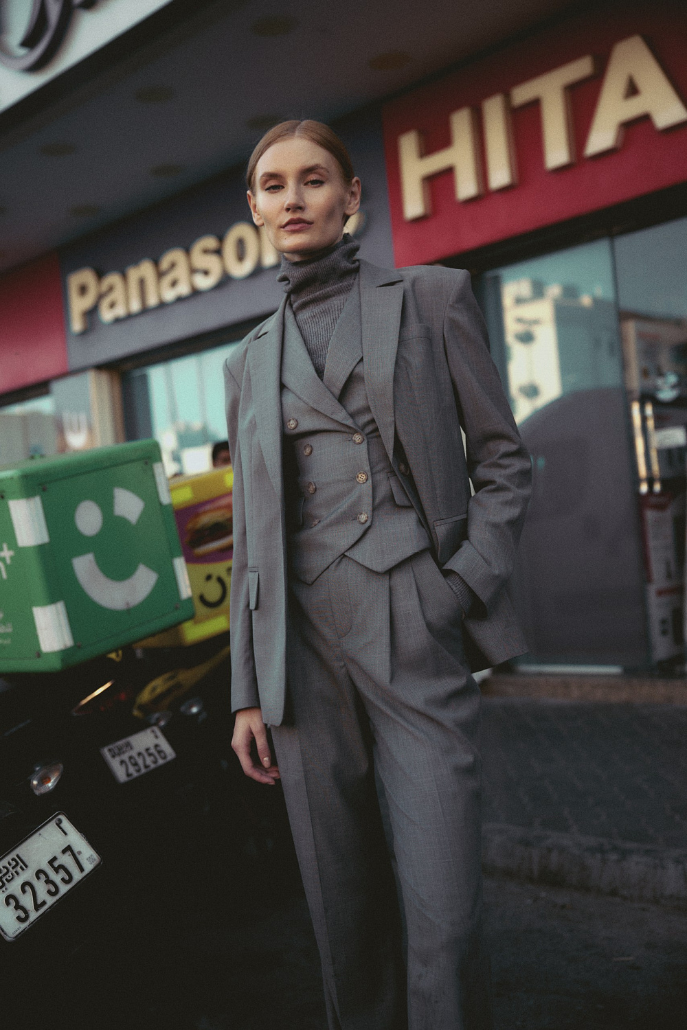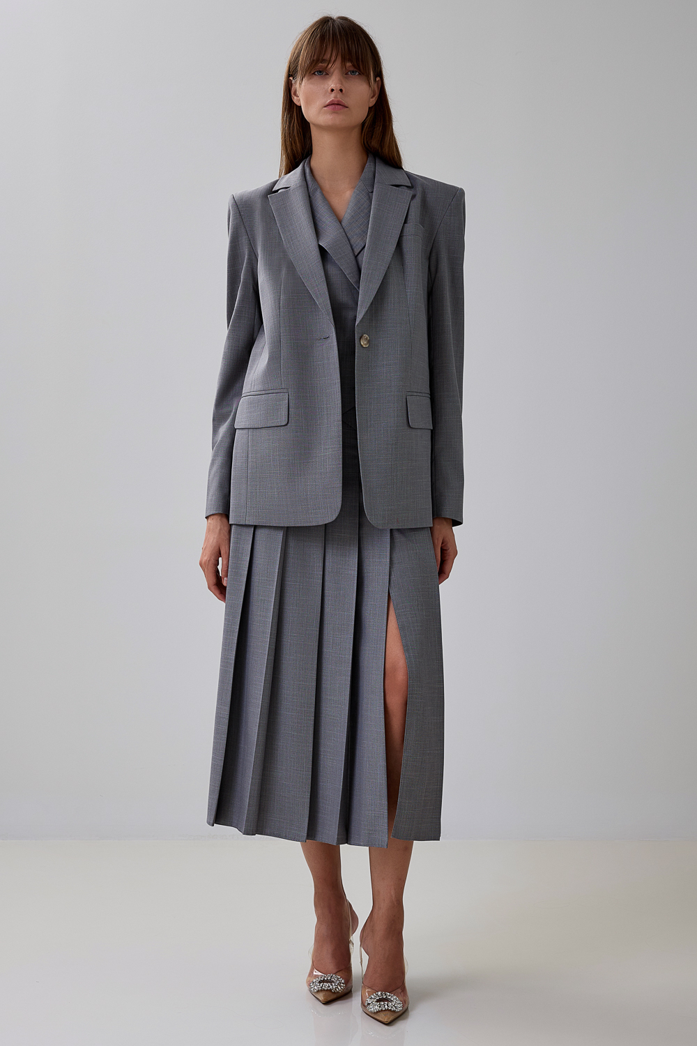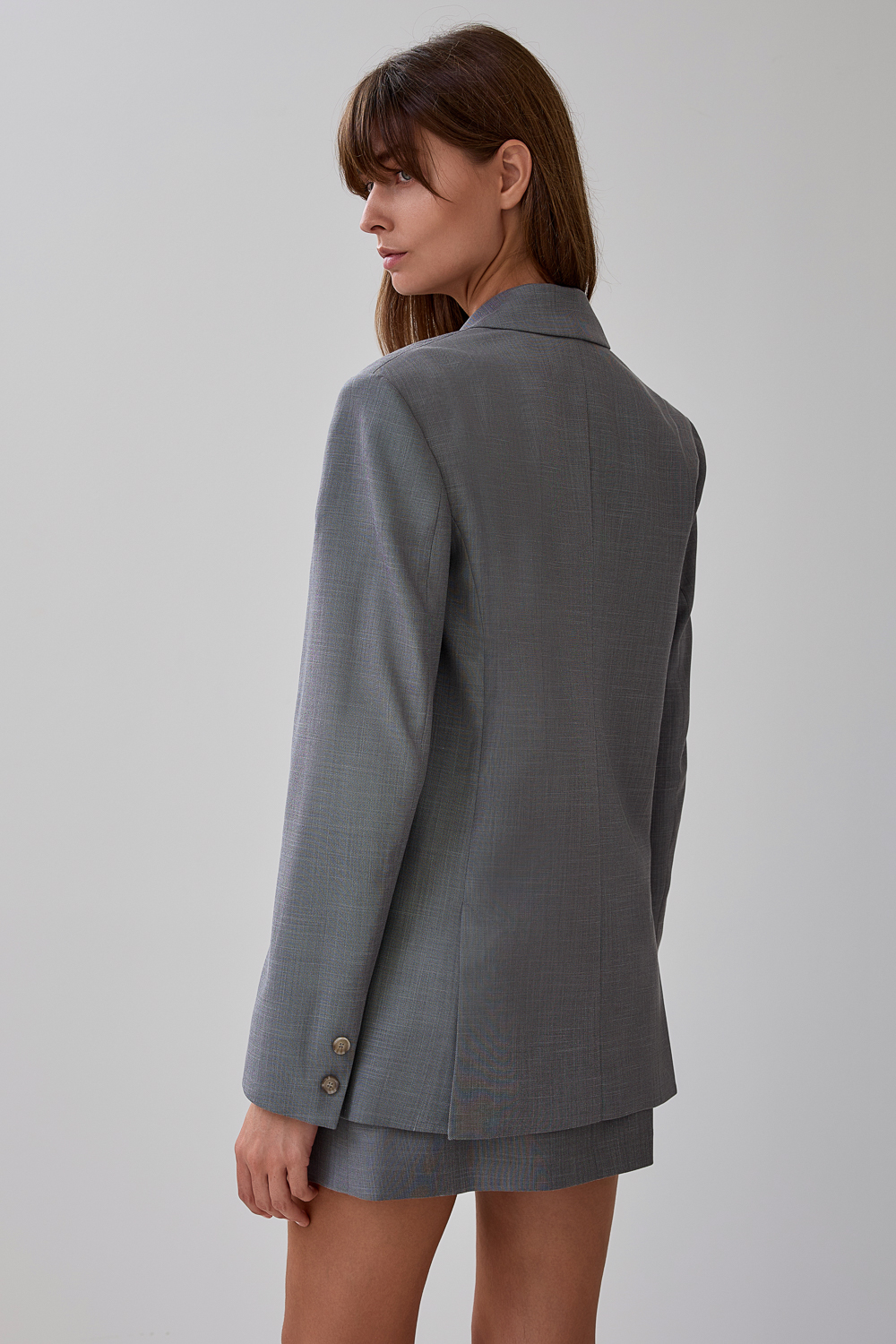 Однобортный прямой жакет. Состав: 56%полиэстер,30 %вискоза,14% сорона; Подкладка: 95% полиэстер, 5% эластан