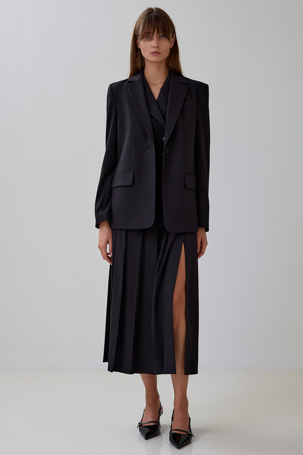 Однобортный прямой жакет. Состав: 56%полиэстер,30 %вискоза,14% сорона; Подкладка: 95% полиэстер, 5% эластан