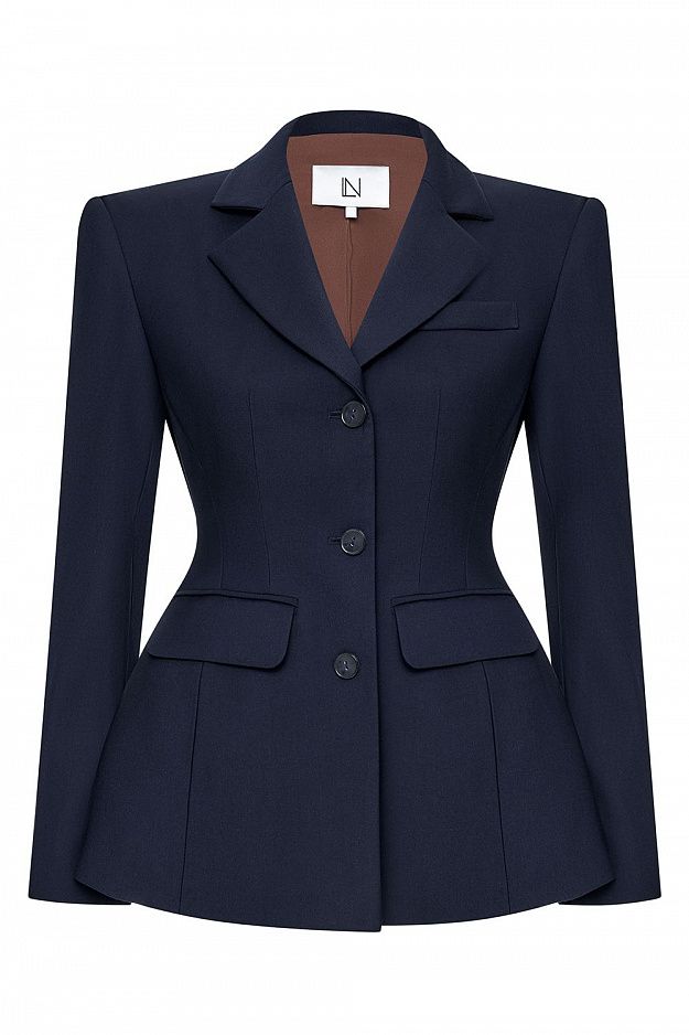 Приталенный жакет из плотной костюмной ткани с акцентом на талию и расклёшенным низом, который формирует женственный силуэт. Классический воротник, застёжка на три пуговицы и карманы с клапанами подчеркивают элегантность модели. Контрастная подкладка добавляет стильных деталей. Состав: 67% полиэстер, 30% вискоза, 3% эластан; подкладка: 95% полиэстер, 5% эластан
