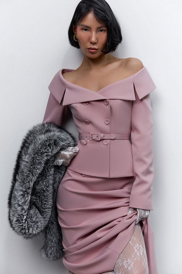 Жакет выполнен из плотной костюмной ткани. Модель отличается элегантным дизайном с открытыми плечами и широким отложным воротником, который придаёт образу утончённость. Двубортная застёжка декорирована крупными пуговицами в тон изделия. Талия подчеркнута съемным ремнём с пряжкой, создающим изящный силуэт «песочные часы». Длинные рукава и аккуратная посадка по фигуре делают жакет универсальным вариантом для вечерних выходов. Состав: 60% полиэстер, 35% вискоза, 5% эластан, Подкладка 95% полиэстер, 5% эластан