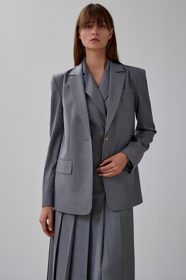 Однобортный прямой жакет. Состав: 56%полиэстер,30 %вискоза,14% сорона; Подкладка: 95% полиэстер, 5% эластан