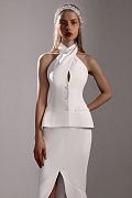 Эта модель переосмысливает классический жилет, превращая его в выразительный топ с архитектурным силуэтом. Перекрёстный халтер-воротник открывает линию плеч, а фигурный вырез добавляет тонкий акцент женственности. Приталенный крой подчёркивает фигуру, создавая чистый и вытянутый силуэт. Застёжка на пуговицы и аккуратные карманы отсылают к классическому тейлорингу. Идеально сочетается как с юбками, так и с брюками, формируя современный вечерний или дневной образ.Состав:71% полиэстер, 23% вискоза, 6% эластан, Подклад 95% полиэстер 5% эластан