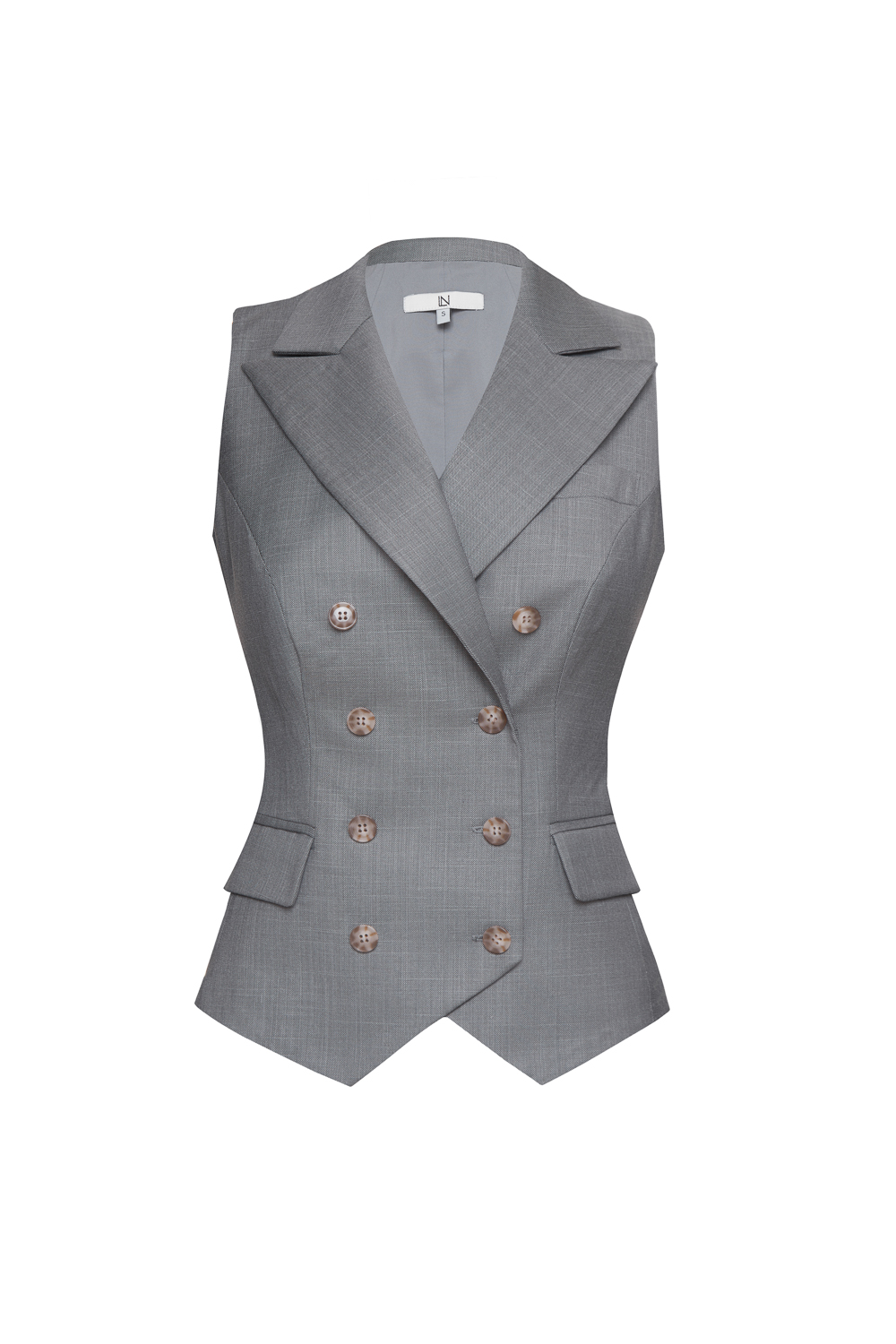 Классический двубортный жилет, застегивается на пуговицы спереди. Длина по спинке: 50 см. К жилету идеально подойдут жакет артикул: 56842, юбка артикул: 57122, брюки артикул: 56880.Состав: 56%полиэстер,30 %вискоза,14% сорона. Подкладка: 95% полиэстер, 5% эластан.
