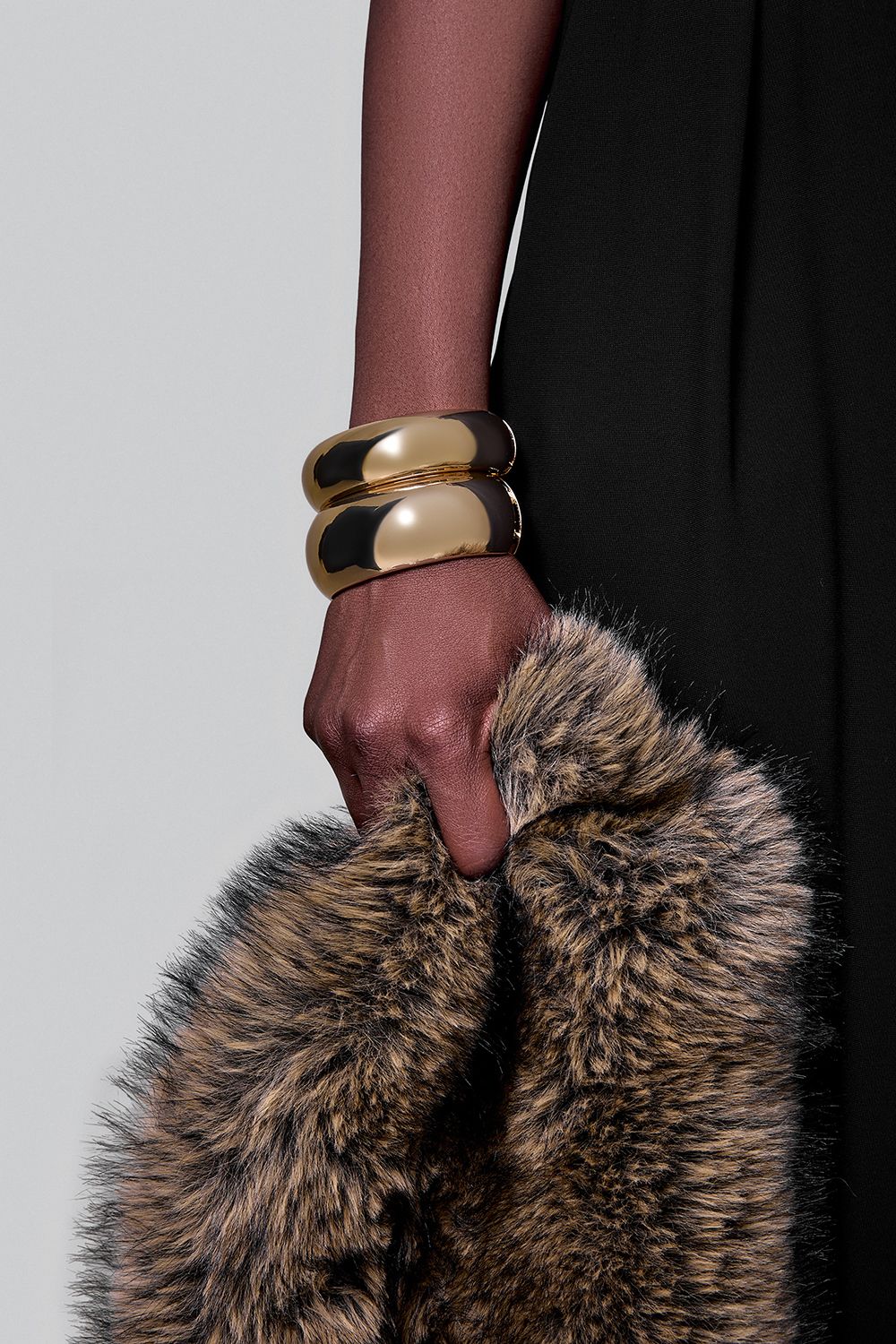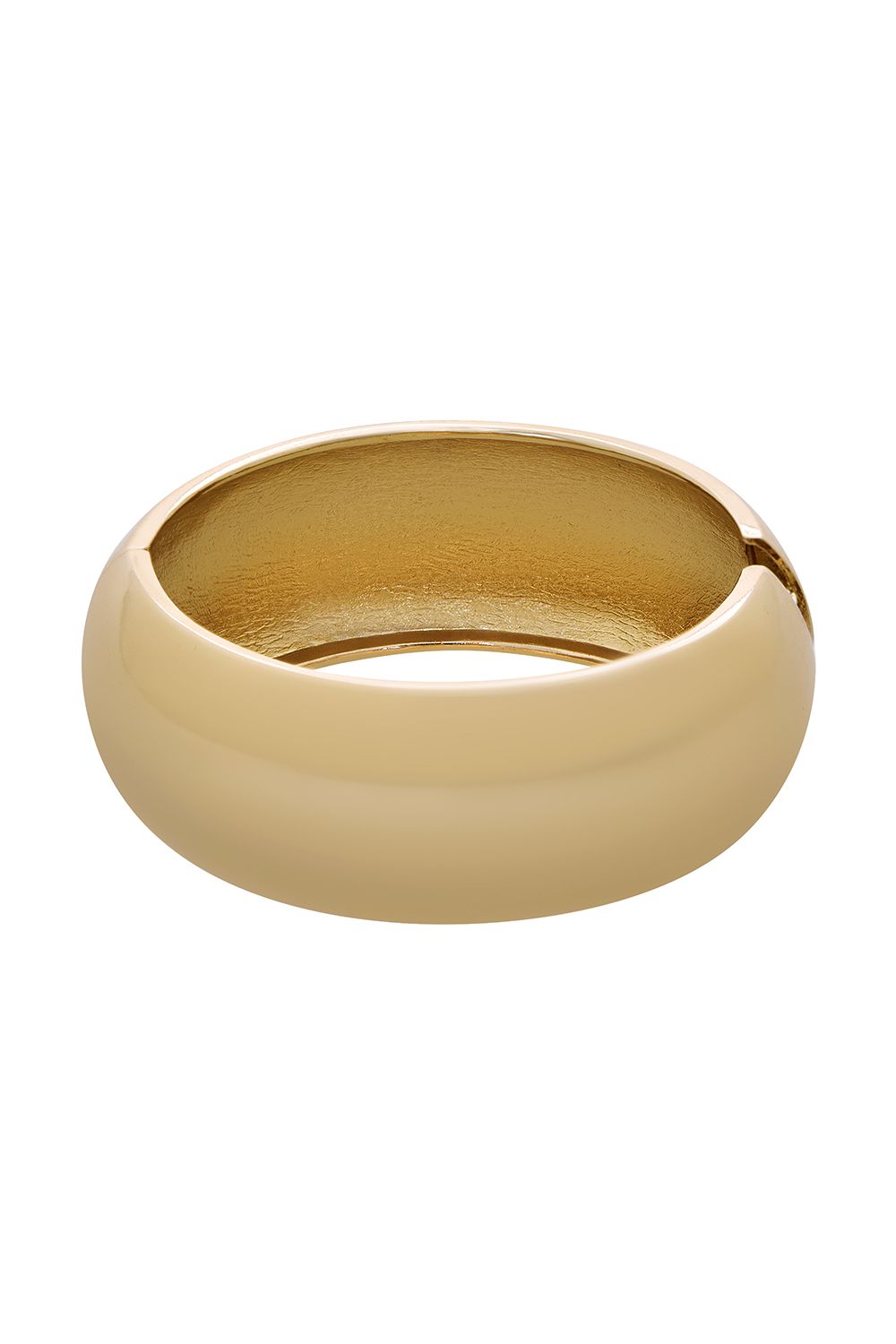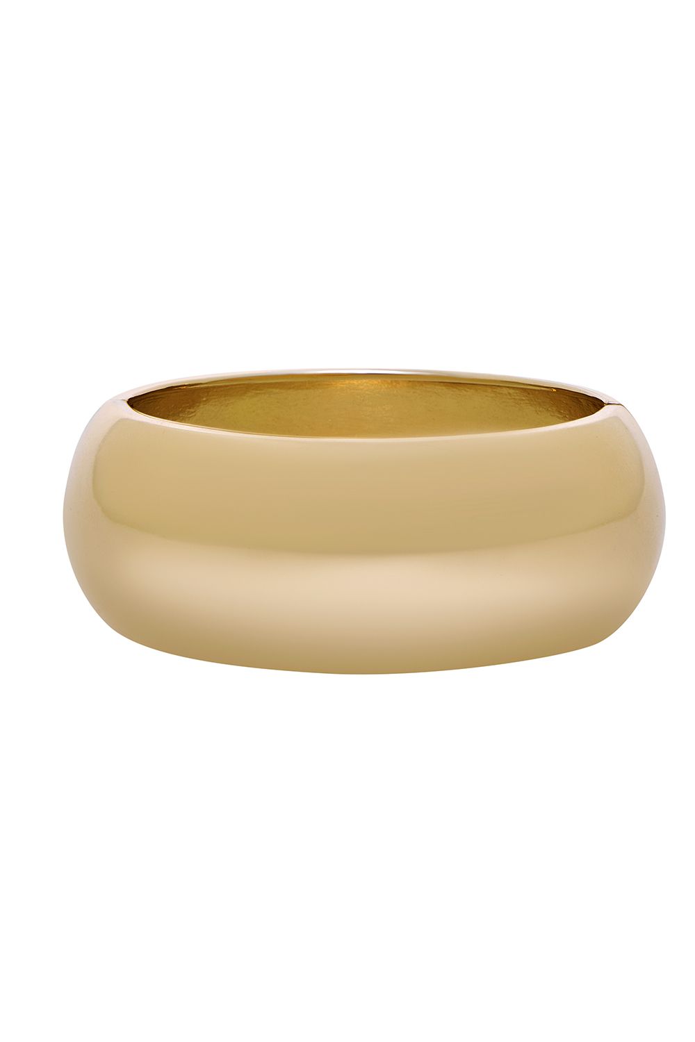 Крупный браслет с мягко закруглёнными краями. Металлическая поверхность отполирована до зеркального блеска, что придаёт украшению эффектный и современный вид. Цвет — теплый золотой, без лишних декоративных элементов, что делает браслет универсальным акцентом в образе.Состав: Металл/акрил