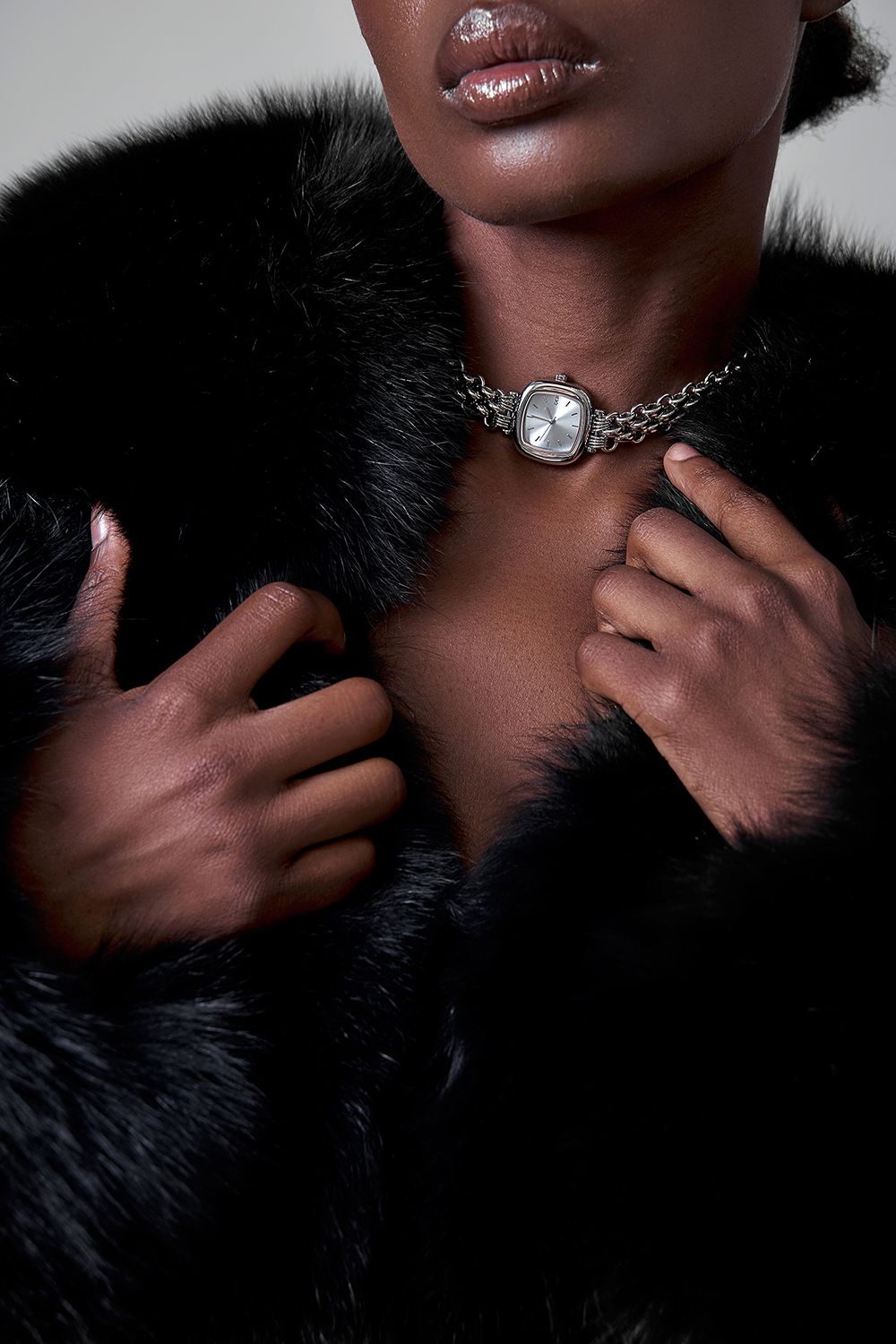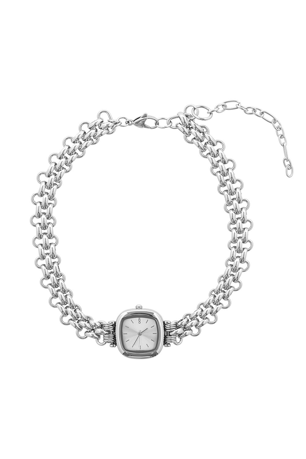 Эффектный чокер, выполненный из массивной цепочки серебристого цвета, украшен оригинальной деталью - миниатюрным циферблатом в винтажном стиле. Такой аксессуар объединяет в себе украшение и элемент часовой классики, создавая уникальный акцент в образе. Его можно носить на шее как акцентный чокер или на руке как массивный браслет. Идеально сочетается как с элегантными жакетами, так и с вечерними нарядами.Состав: 100% металл