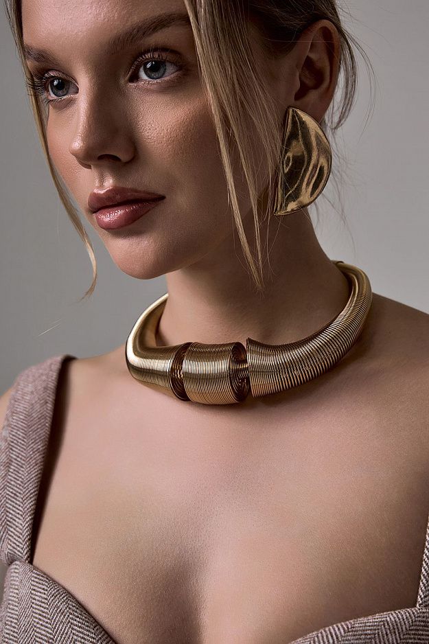 Эффектное колье в стиле минимализм, созданное для смелых акцентов в образе. Украшение выполнено из гибкого металлического жгута, оформленного плотной спиральной намоткой, создающей впечатление динамичного движения и современного дизайна. Центральный элемент в виде объемных колец придаёт изделию архитектурный характер и подчёркивает индивидуальность. Состав: 100% металл