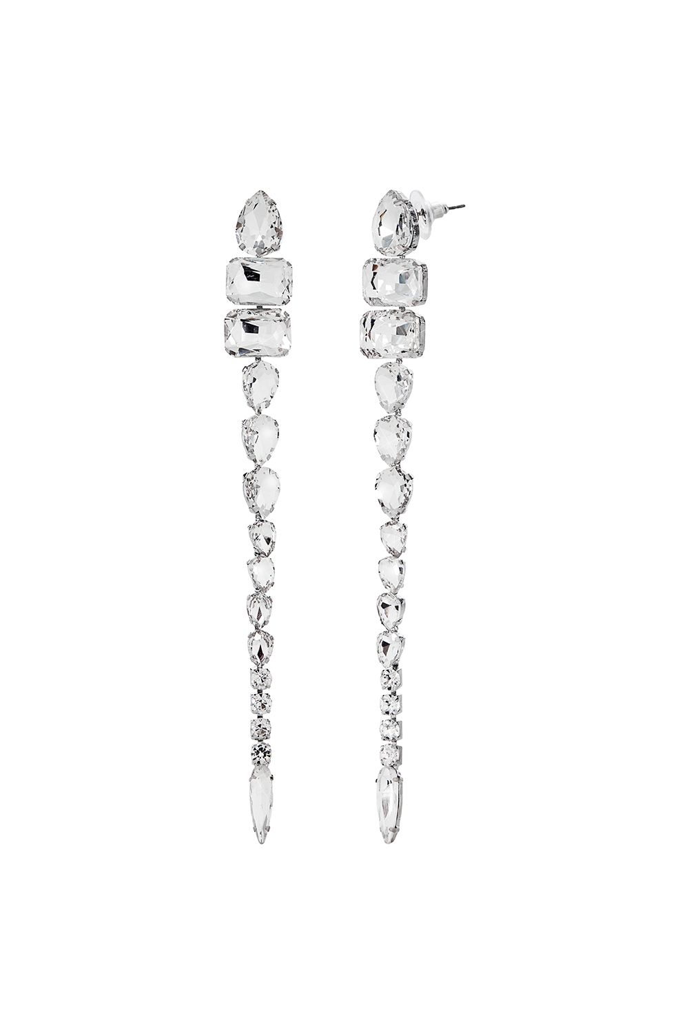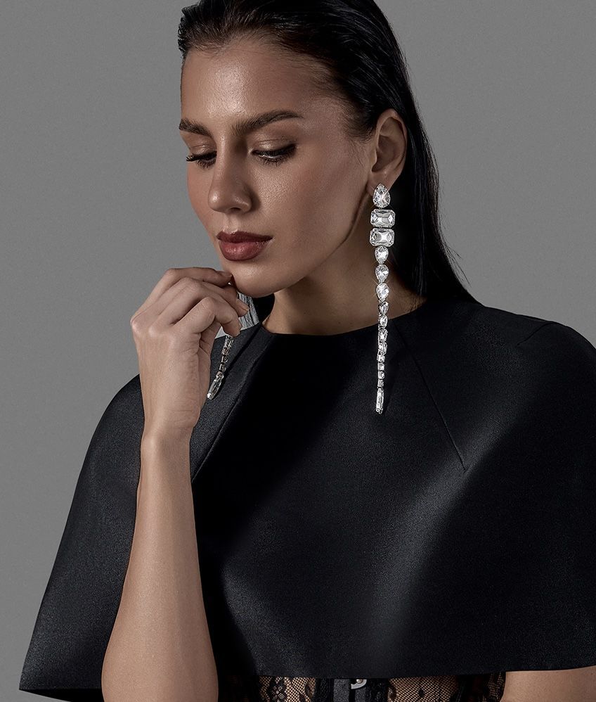 Длинные серьги-каскад из прозрачных огранённых кристаллов - эффектный аксессуар, который визуально вытягивает линию шеи и добавляет образу сияния. Камни разной формы плавно переходят друг в друга, образуя аккуратную «дорожку света», которая красиво переливается при движении. Состав: Металл/стразы