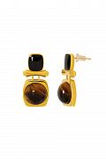 Серьги-подвески с черным и тигровым глазом в золотистой оправе