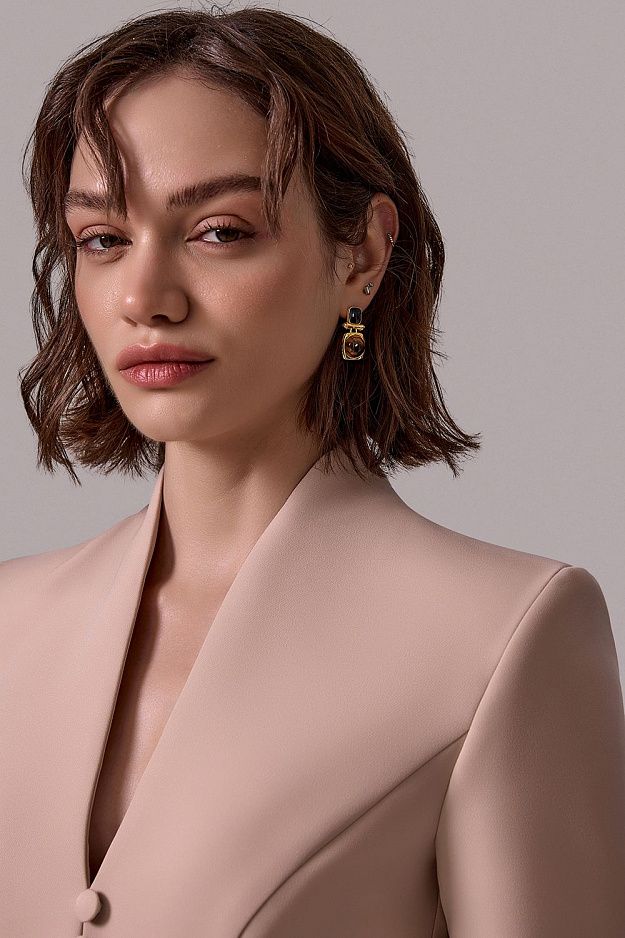 Элегантные серьги в винтажном стиле станут акцентом в любом образе. Верхняя часть украшена гладким черным камнем прямоугольной формы, изысканно обрамлённым в золотую оправу. Под ним расположен подвес с объемным круглым элементом, создающим гармоничный баланс между лаконичностью и выразительностью. Состав: Металл/Серебро