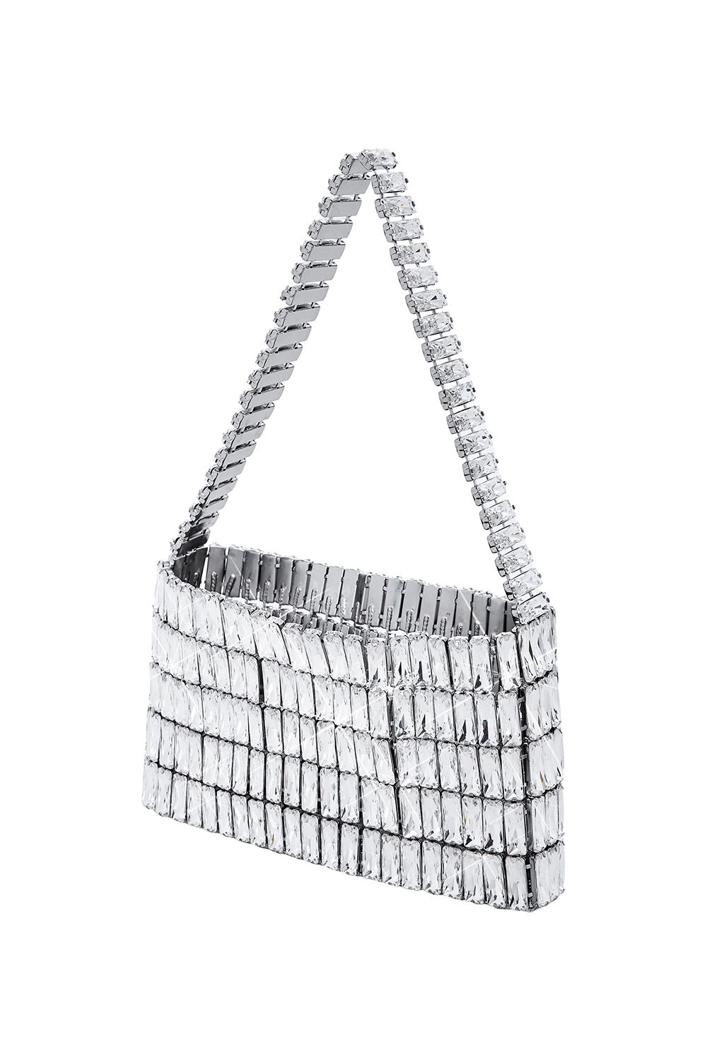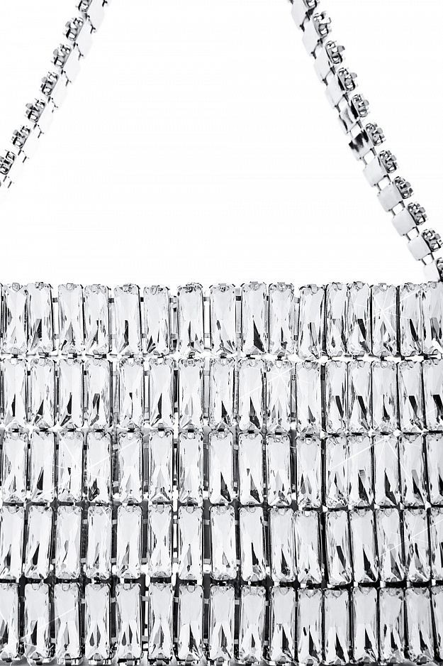 Эффектная вечерняя сумка, полностью собранная из прямоугольных гранёных кристаллов, выстроенных ровными архитектурными рядами. Благодаря металлической жёсткой основе изделие сохраняет форму, подчёркивая чистую геометрию силуэта. Состав: 100% металл/стекло