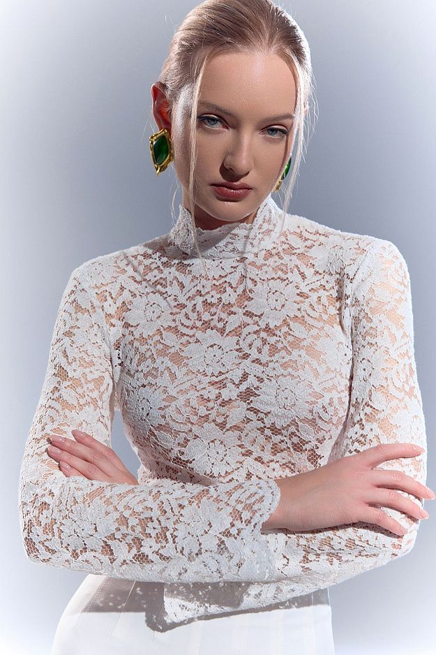 Элегантный топ из тонкого кружевного полотна. Изделие выполнено с высоким горлом и длинными рукавами, полностью покрытыми цветочным кружевом. Прилегающий силуэт подчёркивает линии фигуры, создавая утончённый и женственный образ. Идеален для вечерних выходов, сочетаний с жакетами, юбками или брюками с высокой посадкой. Состав: 80% хлопок, 20% полиэстер