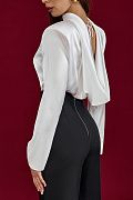 Элегантная блуза из гладкого атласного материала с мягким блеском. Спереди — лаконичный дизайн с высоким воротом-стойкой, а сзади — эффектная драпированная линия декольте, фиксирующаяся тонкими завязками. Длинные рукава создают изящный силуэт, а прямой крой обеспечивает комфортную посадку. Состав: 97% полиэстер, 3% спандекс
