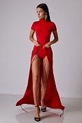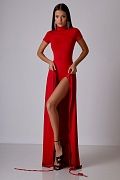 Облегающее боди из эластичного материала с высоким воротником и коротким рукавом. Застегивается на кнопки снизу. Состав: 92% полиэстер, 8% спандекс.
