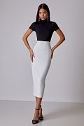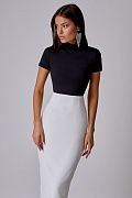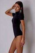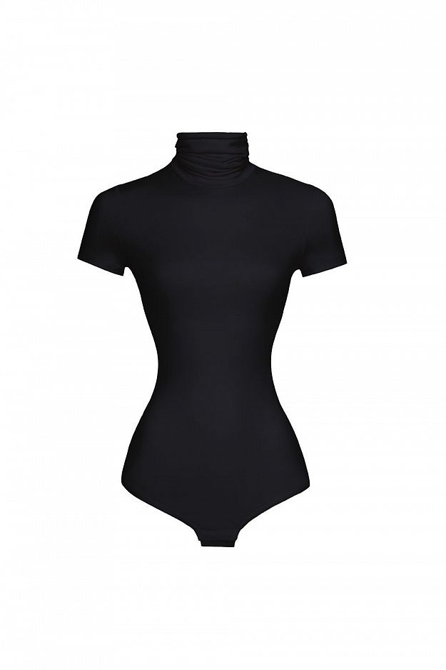 Облегающее боди из эластичного материала с высоким воротником и коротким рукавом. Застегивается на кнопки снизу. Состав: 92% полиэстер, 8% спандекс.