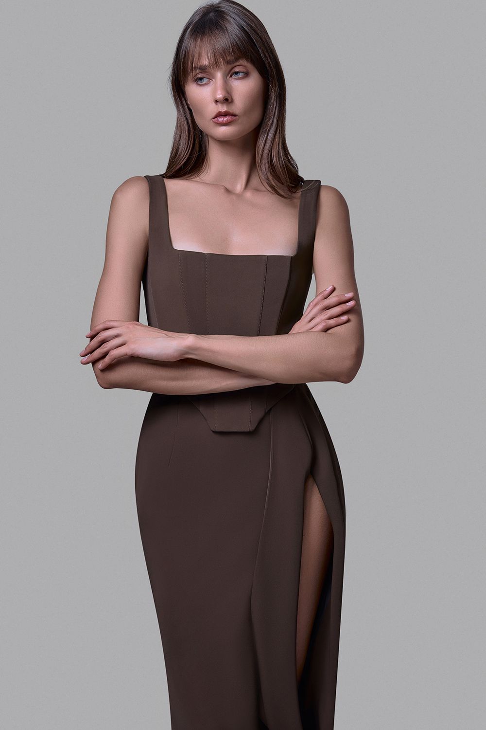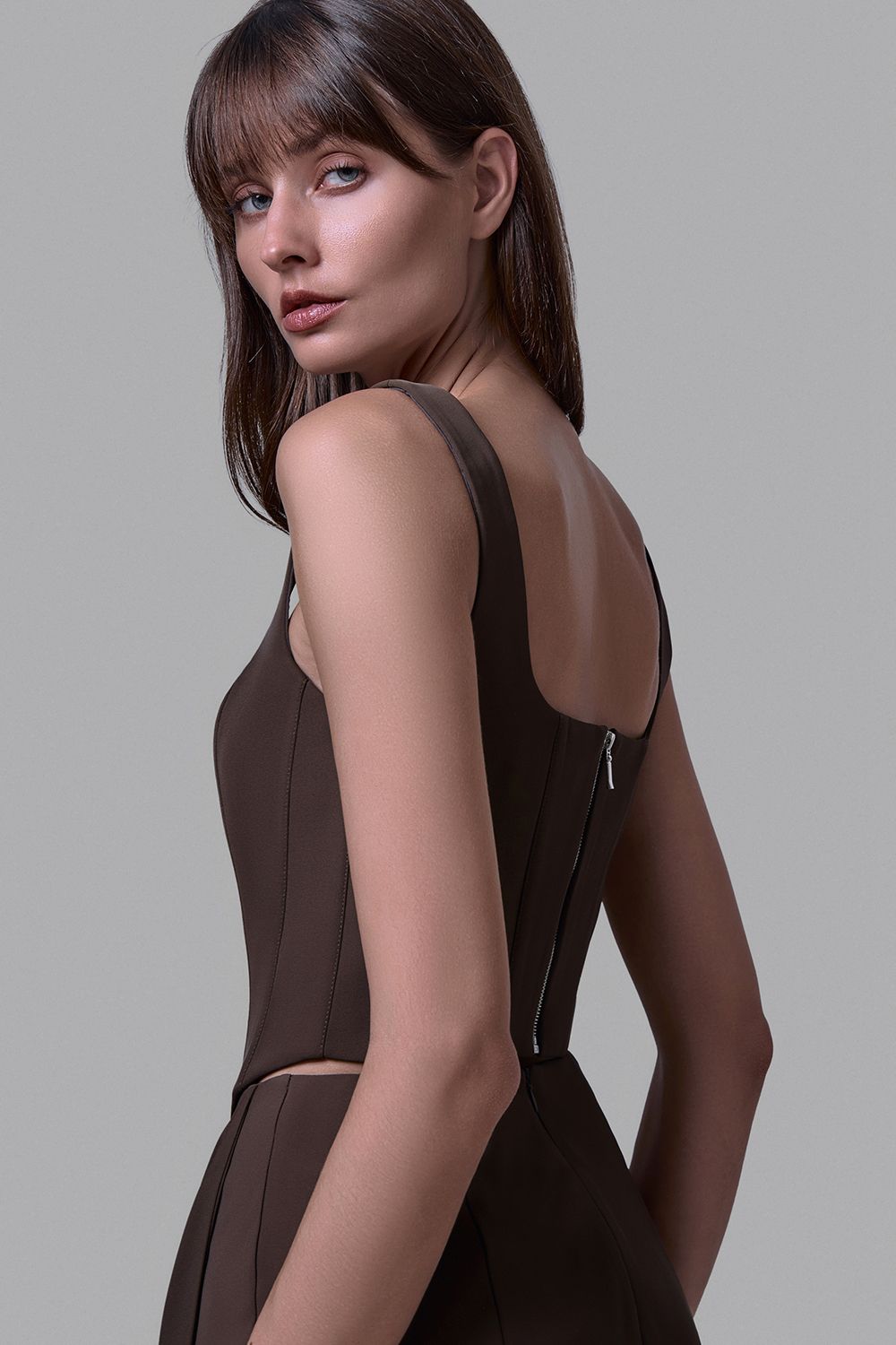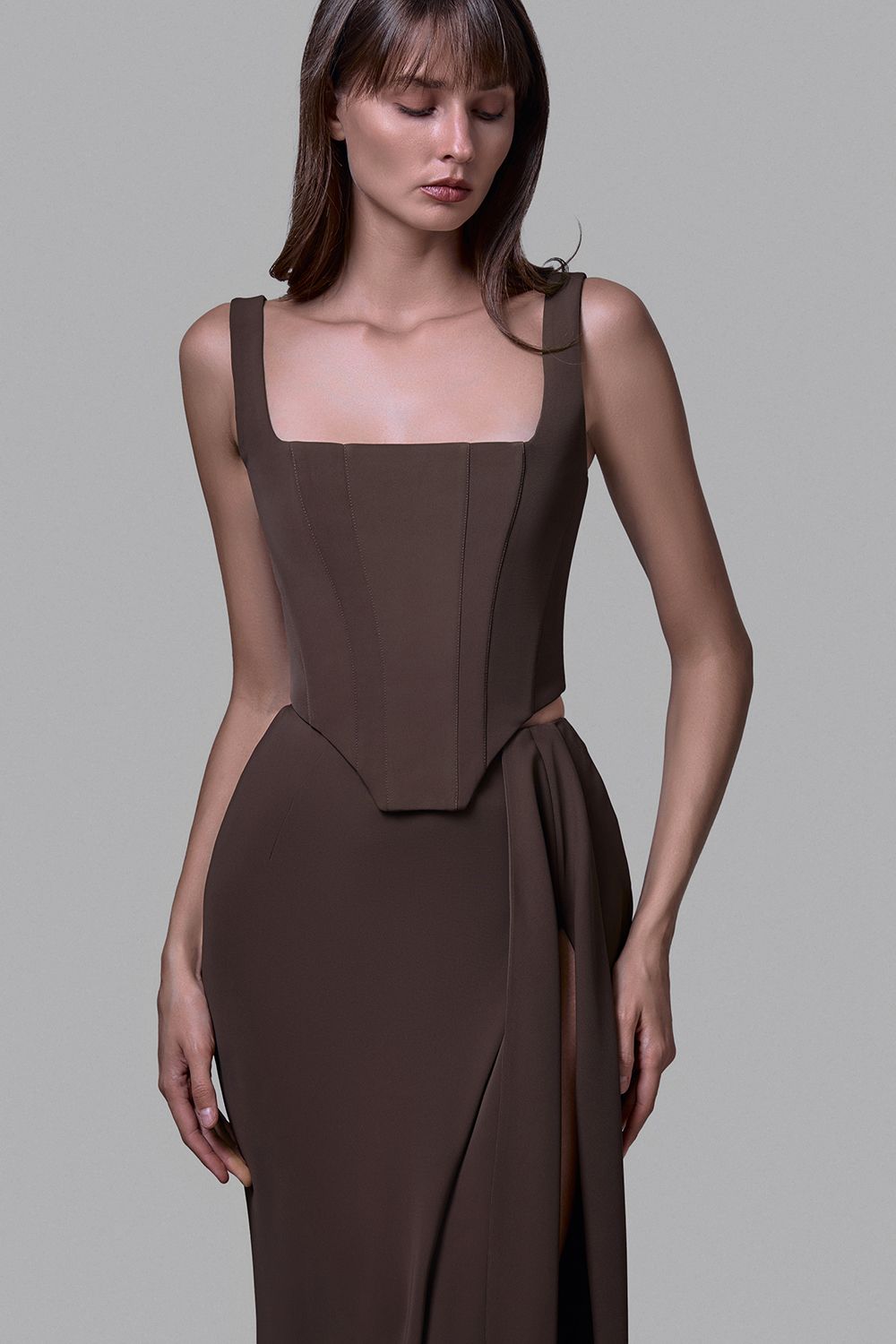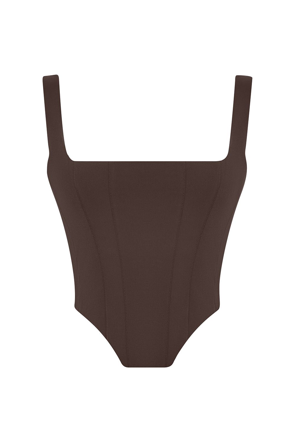 Корсет с широкими бретелями и квадратным вырезом.Приталенный силуэт с фигурным низом подчеркивает талию и создаёт акцент на линии груди. Жёсткие вертикальные вытачки формируют чёткую геометрию, а плотная ткань держит форму, обеспечивая идеальную посадку. Состав: 72% полиэстер, 15% нейлон, 10% вискоза, 3% эластан;подкладка:95% полиэстер,5% эластан