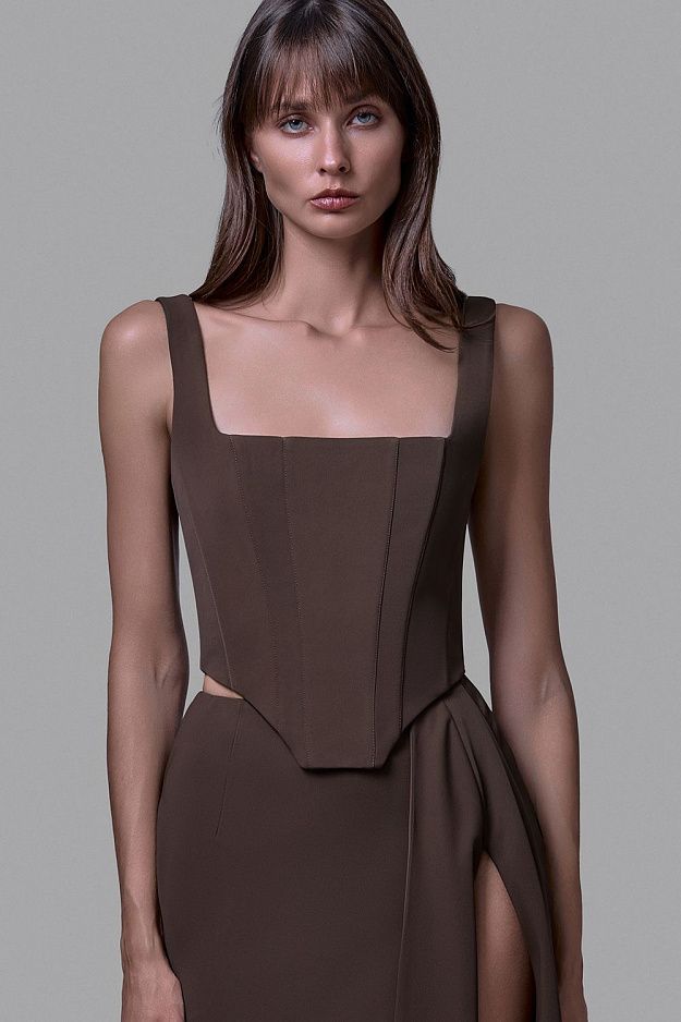 Корсет с широкими бретелями и квадратным вырезом.Приталенный силуэт с фигурным низом подчеркивает талию и создаёт акцент на линии груди. Жёсткие вертикальные вытачки формируют чёткую геометрию, а плотная ткань держит форму, обеспечивая идеальную посадку. Состав: 72% полиэстер, 15% нейлон, 10% вискоза, 3% эластан;подкладка:95% полиэстер,5% эластан