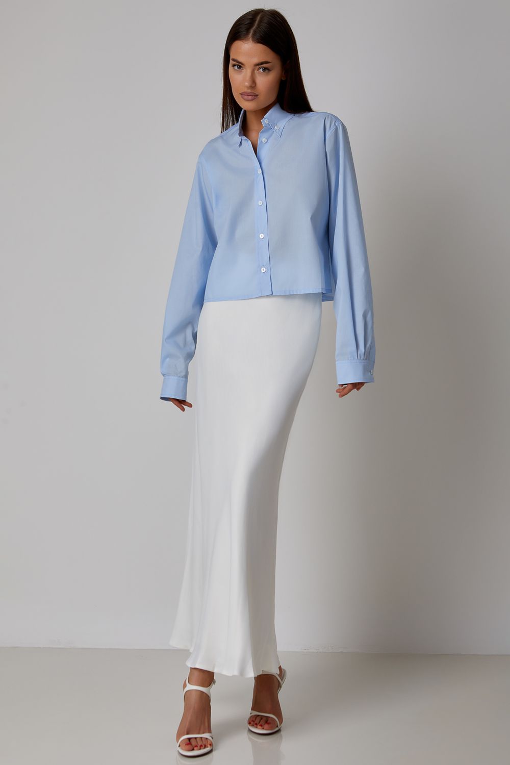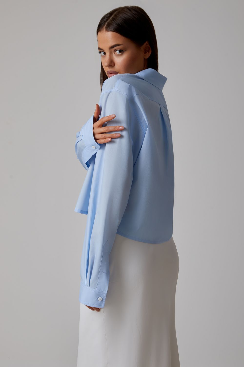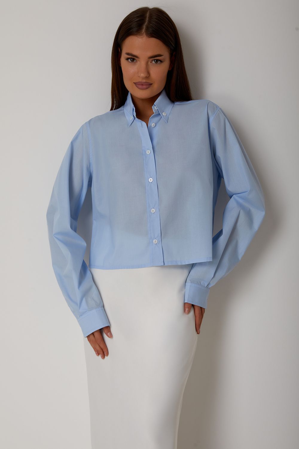 Стильная укороченная рубашка из хлопка. Классический воротник и застёжка на пуговицы придают образу элегантность, а прямой свободный крой обеспечивает комфорт и современное звучание. Идеально сочетается как с юбками, так и с брюками, позволяя создавать как деловые, так и повседневные образы. Состав: 65% хлопок, 35% полиэстер