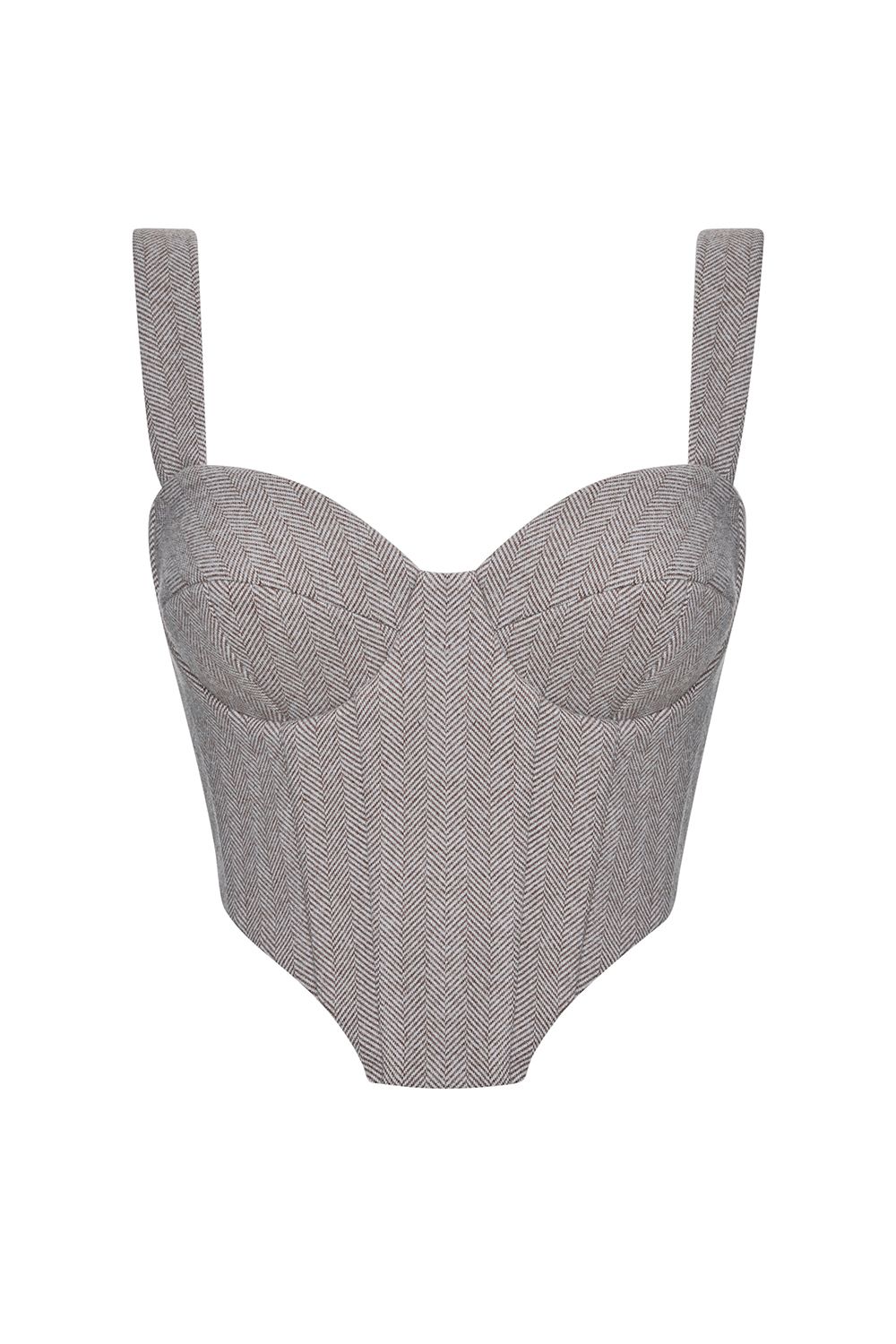 Корсет из плотной костюмной ткани с выразительным силуэтом и акцентом на линию груди. Модель выполнена в классическом стиле с рельефными швами и имитацией косточек, формирующих четкий, женственный силуэт. Широкие бретели обеспечивают комфорт и поддержку, а плотная посадка подчёркивает талию. Идеально сочетается с жакетом и мини-юбкой из той же ткани для создания современного образа. Состав: 75% полиэстер, 25% вискоза, Подклад 95% полиэстер, 5% эластан