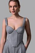Корсет из плотной костюмной ткани с выразительным силуэтом и акцентом на линию груди. Модель выполнена в классическом стиле с рельефными швами и имитацией косточек, формирующих четкий, женственный силуэт. Широкие бретели обеспечивают комфорт и поддержку, а плотная посадка подчёркивает талию. Идеально сочетается с жакетом и мини-юбкой из той же ткани для создания современного образа. Состав: 75% полиэстер, 25% вискоза, Подклад 95% полиэстер, 5% эластан