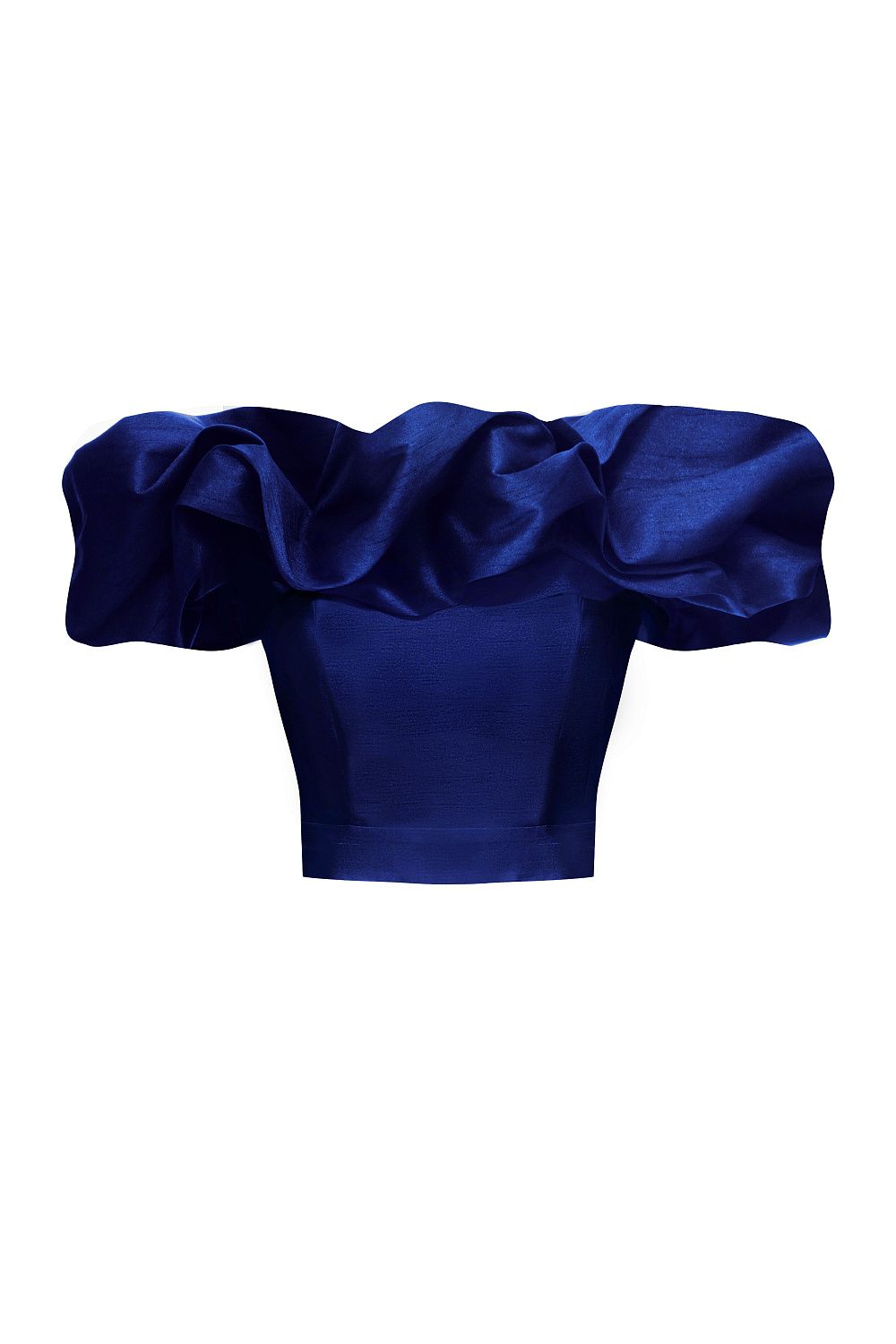 Эффектный топ-бюстье с открытыми плечами выполнен из плотной ткани с легким сатиновым блеском. Модель украшена объемными драпированными рюшами по линии декольте, создающими выразительный акцент и придающими образу торжественность и женственность. Идеальный вариант для вечернего выхода или коктейльного образа.. Состав: 88% полиэстер, 12% вискоза, Подкладка 95% полиэстер, 5% эластан