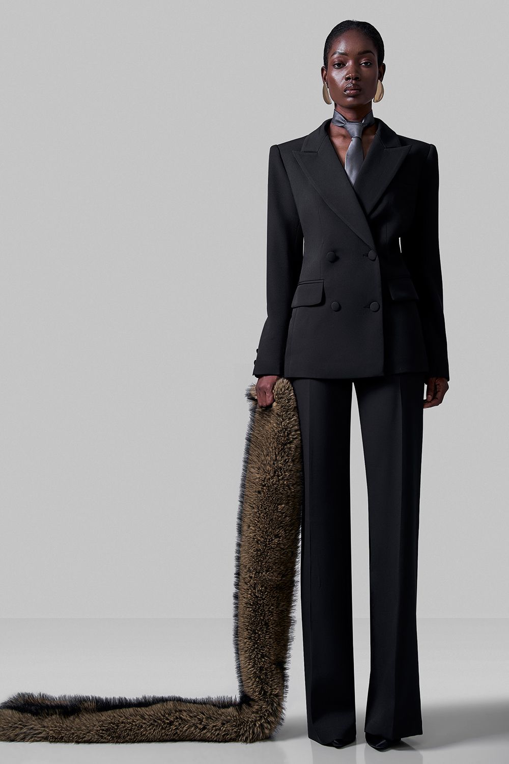 Элегантные брюки из плотной костюмной ткани с высокой посадкой подчёркивают талию и визуально вытягивают силуэт. Прямой крой и идеальная посадка по фигуре создают современный и утончённый образ. Брюки выполнены без лишнего декора, что делает их универсальной базой для вечернего выхода или делового гардероба. Отлично сочетаются как с корсетами и топами, так и с жакетами и рубашками. Состав: 97% полиэстер, 3% спандекс