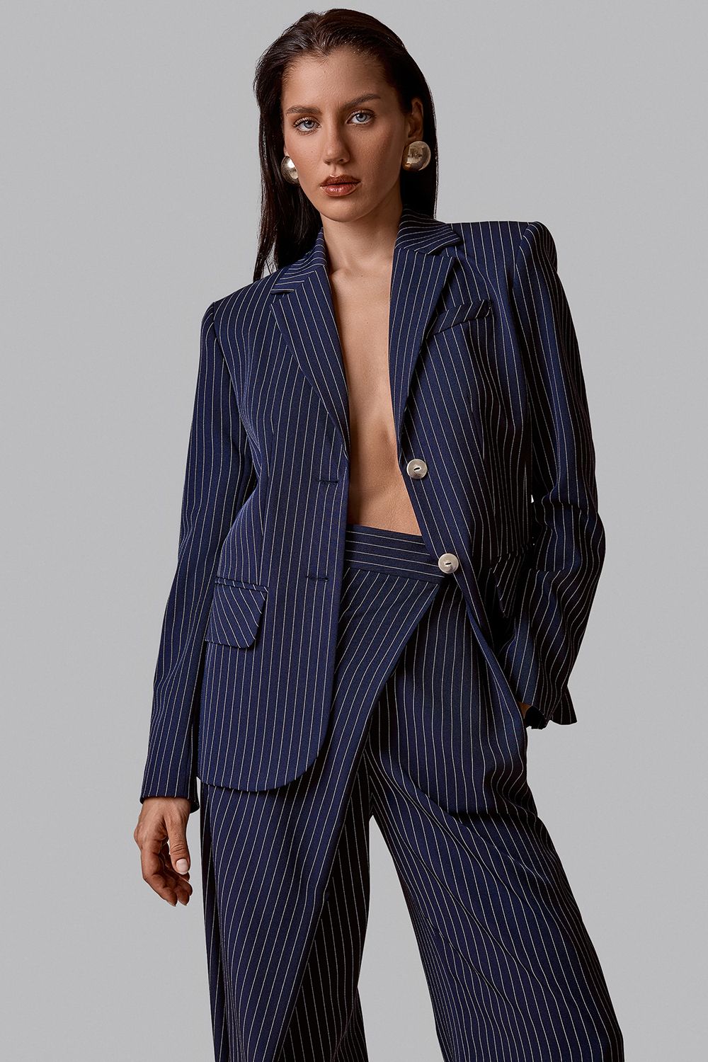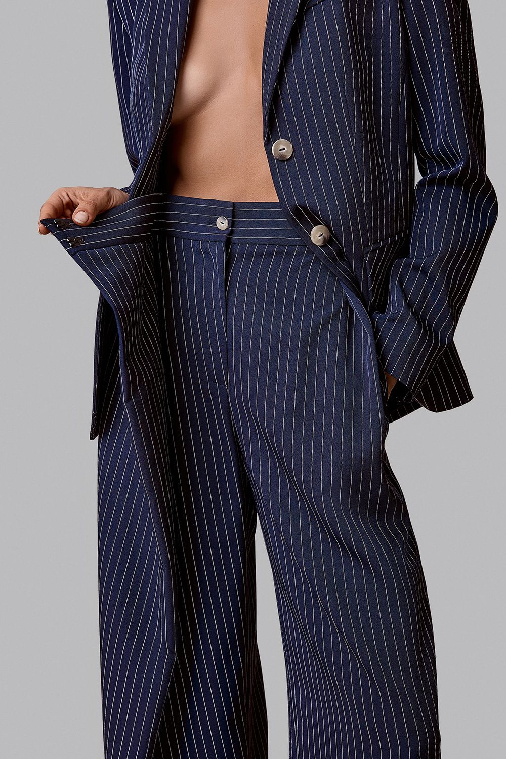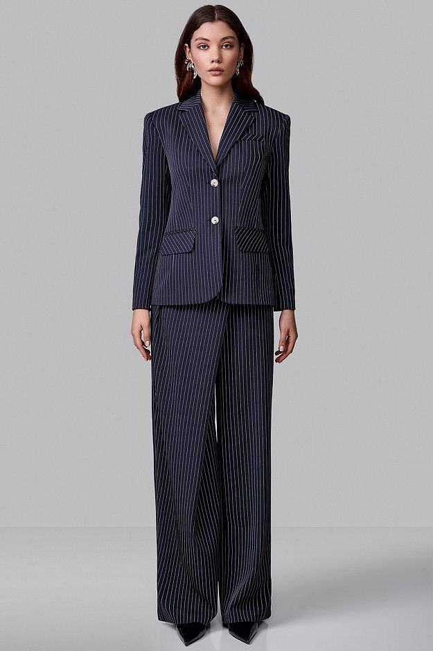 Высокая посадка подчёркивает линию талии, а асимметричный запах формирует выразительную архитектуру силуэта. Мягко расширяющиеся брючины создают плавную вертикаль и визуально вытягивают фигуру. Ткань в деликатную полоску добавляет образу графичность и элегантность. Брюки легко сочетаются с жакетом из комплекта или становятся акцентной частью самостоятельного. Состав: 94% полиэстер, 6% спандекс