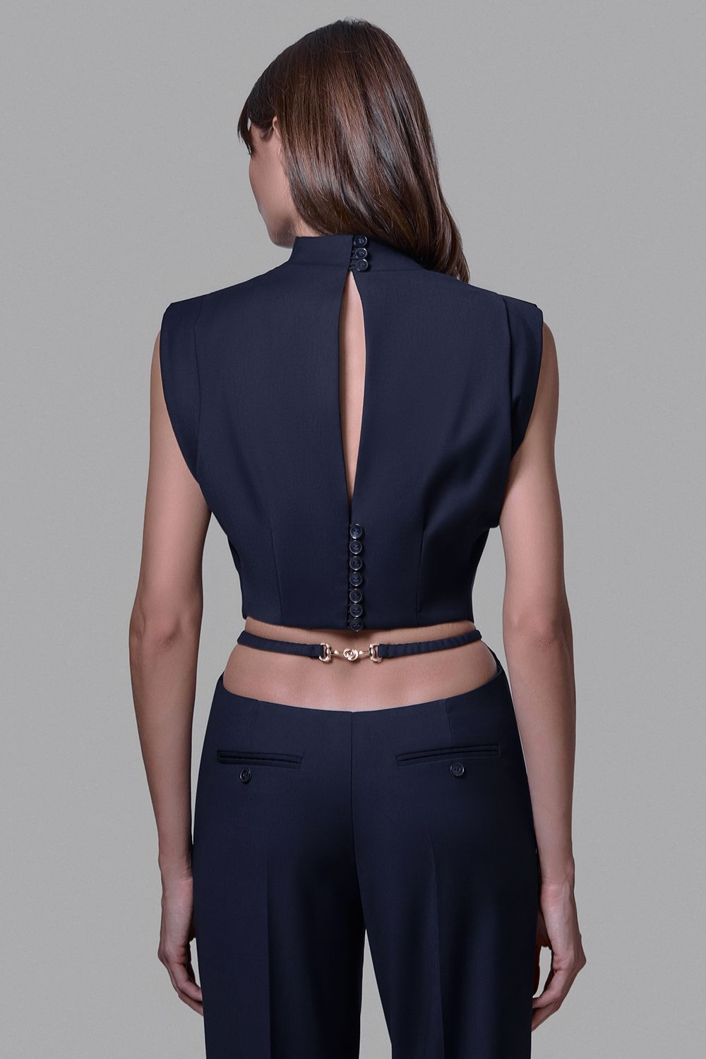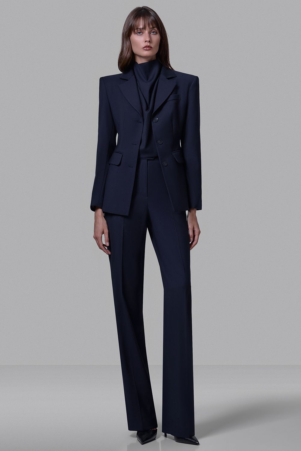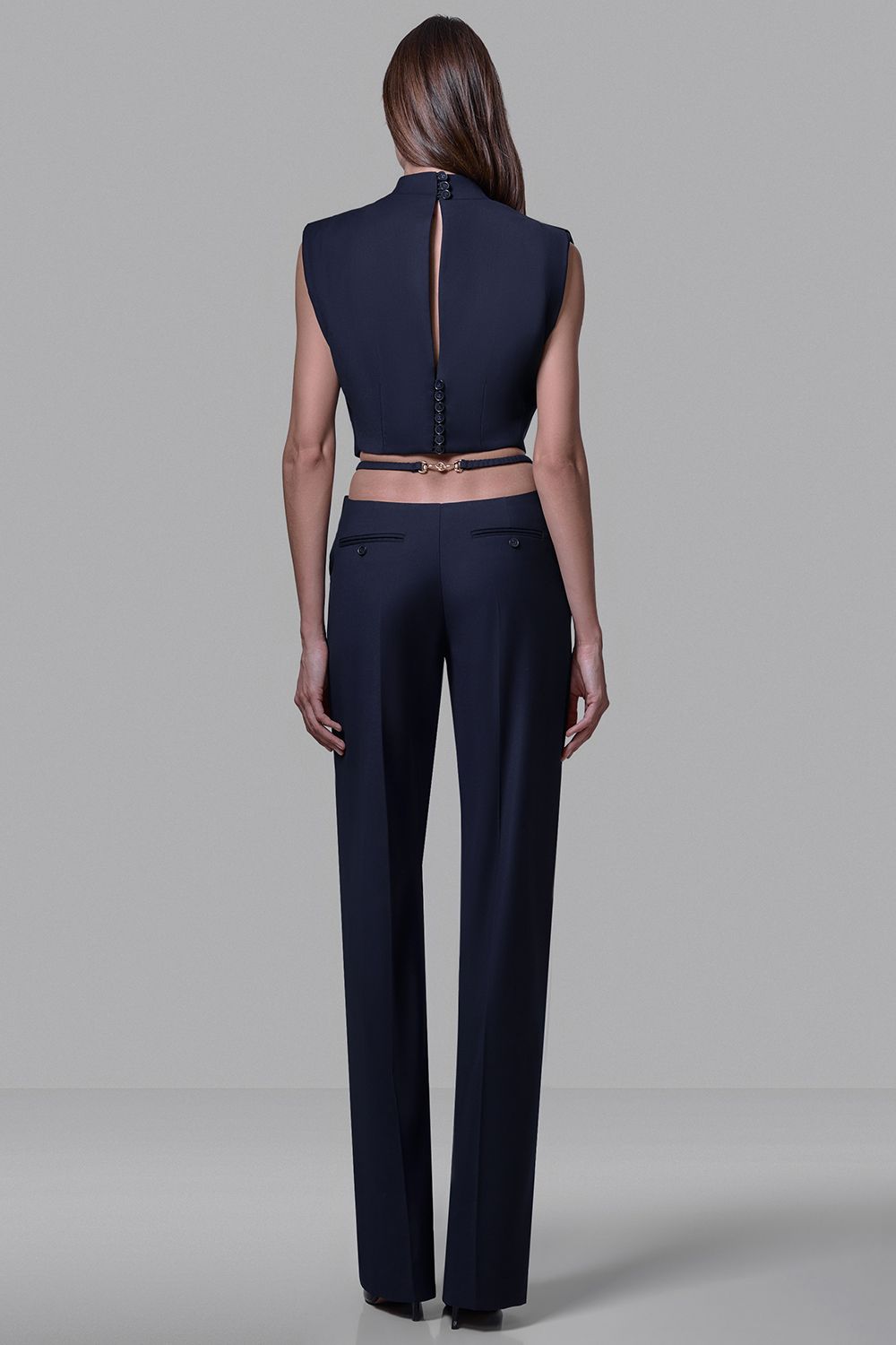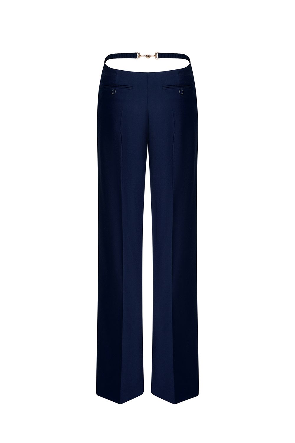 Брюки прямого кроя с высокой посадкой — элегантная база для современного гардероба. Модель выполнена из плотной костюмной ткани, которая хорошо держит форму. Спереди — классическая застёжка на пуговицу и молнию, шлёвки для ремня и боковые карманы. Сзади — декоративные карманы с пуговицами и акцентный ремень с металлической пряжкой, добавляющий образу изысканности. Состав: 67% полиэстер, 30% вискоза, 3% эластан; подкладка: 95% полиэстер, 5% эластан