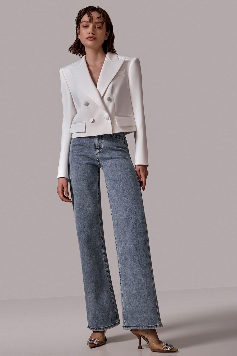 Прямые джинсы с кристаллами и разрезами сзади