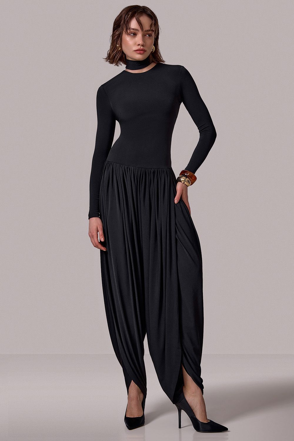 Комбинезон с уникальным дизайнерским кроем: Верх из эластичной ткани — мягко подчеркивает фигуру, обеспечивает комфорт и свободу движений. Длинные рукава и высокий воротник с изящным вырезом создают изысканный акцент. Свободные брюки с драпировкой напоминают восточные шаровары, визуально вытягивают силуэт и добавляют динамики. Состав: 94% полиэстр, 6% спандекс
