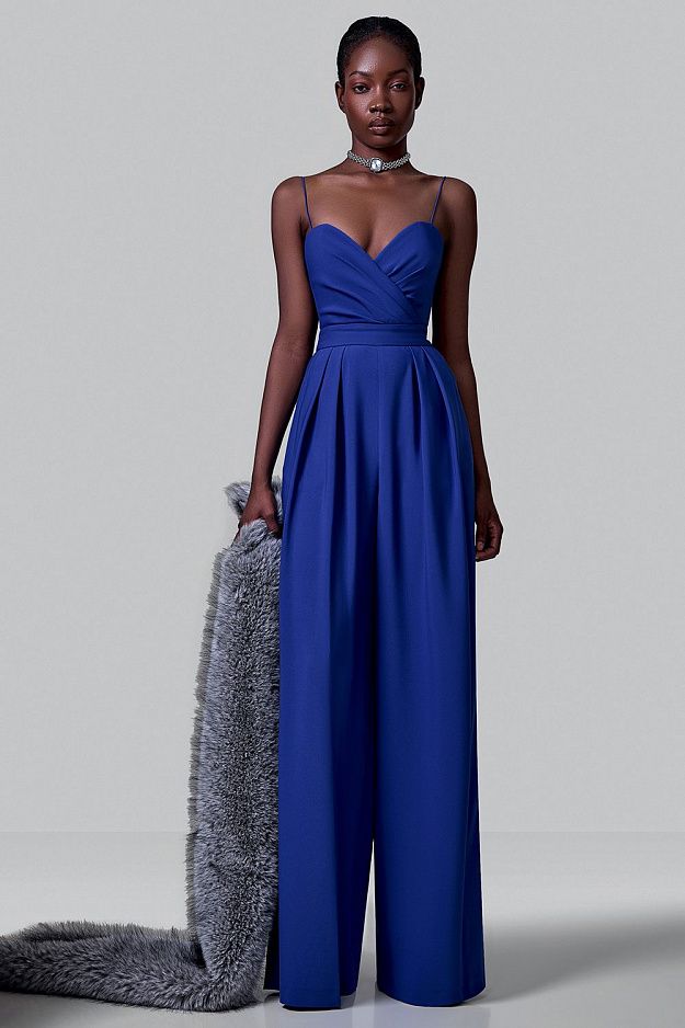 Элегантный комбинезон с открытыми плечами. Комбинезон подчеркивает элегантность и стройность силуэта. Лиф с эффектом запаха и деликатной драпировкой выгодно акцентирует зону декольте. Тонкие бретели придают образу утонченную женственность и визуально вытягивают шею. Высокая линия талии визуально удлиняет ноги, а широкие брючины свободного кроя придают образу свободу движений. Состав: 100% полиэстер, подкладка 95% полиэстер, 5% эластан