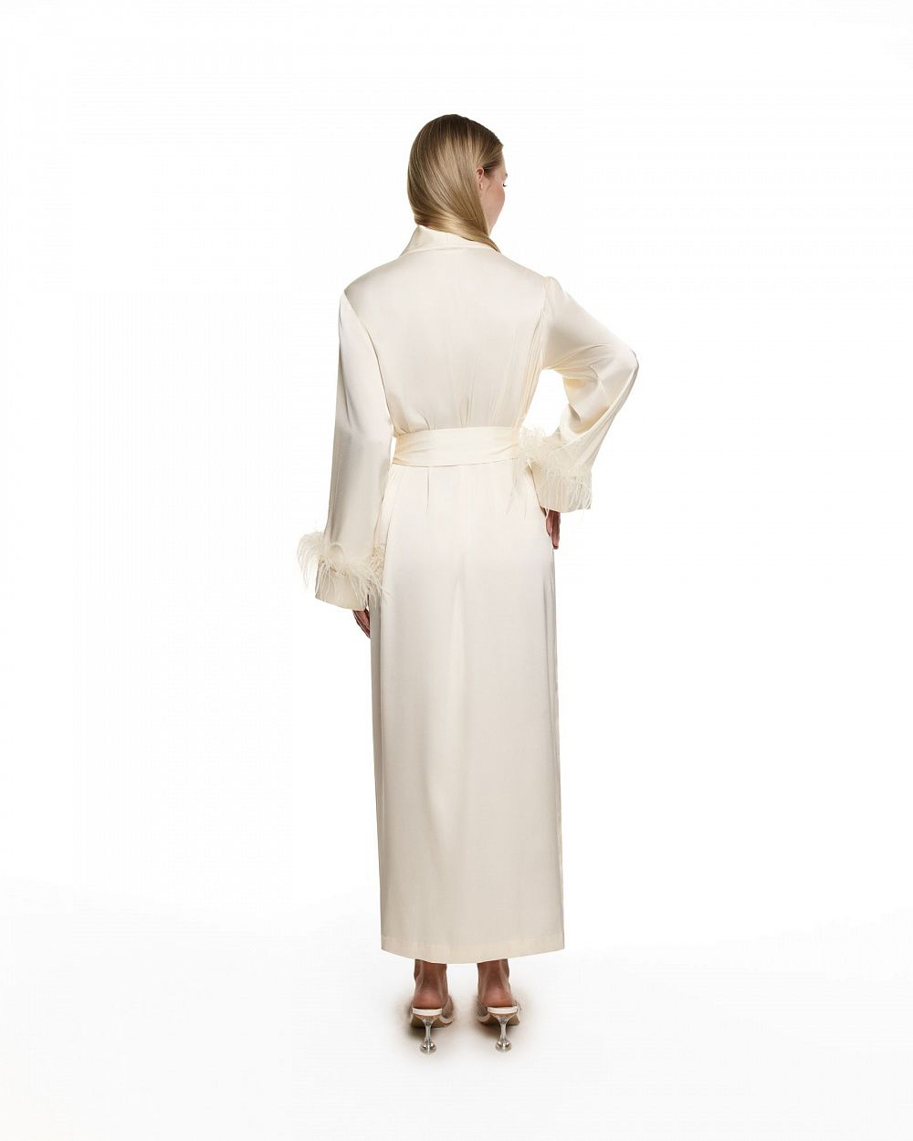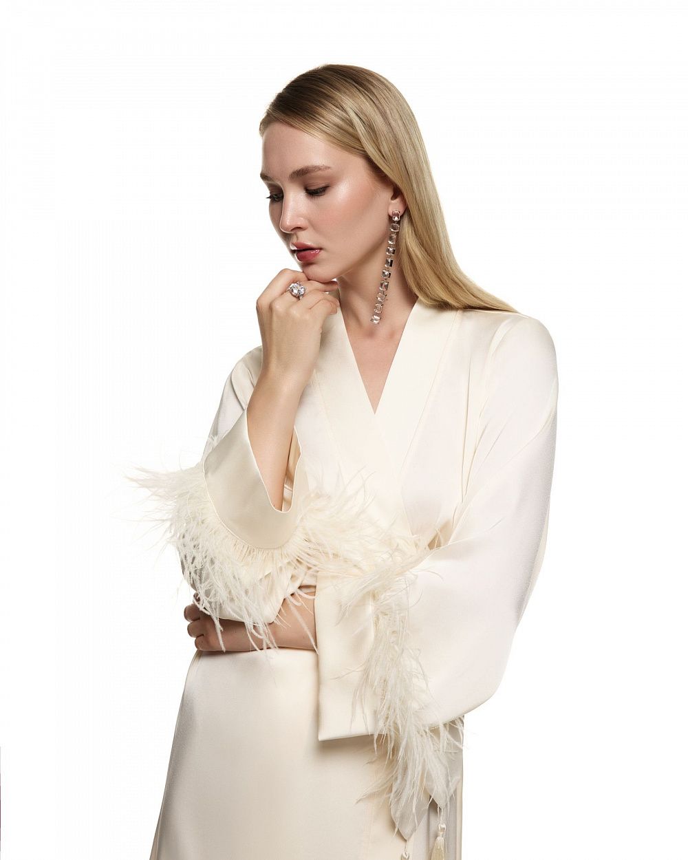 Халат выполненный из гладкого искусственного шелка, он мягко ложится на тело, даря ощущение лёгкости и комфорта. Расклешённые рукава украшены россыпью перьев, добавляющих игривую драматичность и утонченную женственность. Халат фиксируется широким поясом с декоративными кисточками — его можно завязать на талии или носить распущенным, создавая расслабленный, но выразительный силуэт. Состав: 100% искусственный шелк