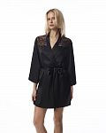 Нежный укороченный халат из гладкого, лёгкого материала с деликатным блеском. Модель украшена изысканными кружевными вставками по линии плеч, которые добавляют образу утончённости и лёгкой романтичности. Свободный рукав и мягкий пояс на талии создают комфортную посадку и подчёркивают силуэт.Состав 95% полиэстер, 5% спандекс