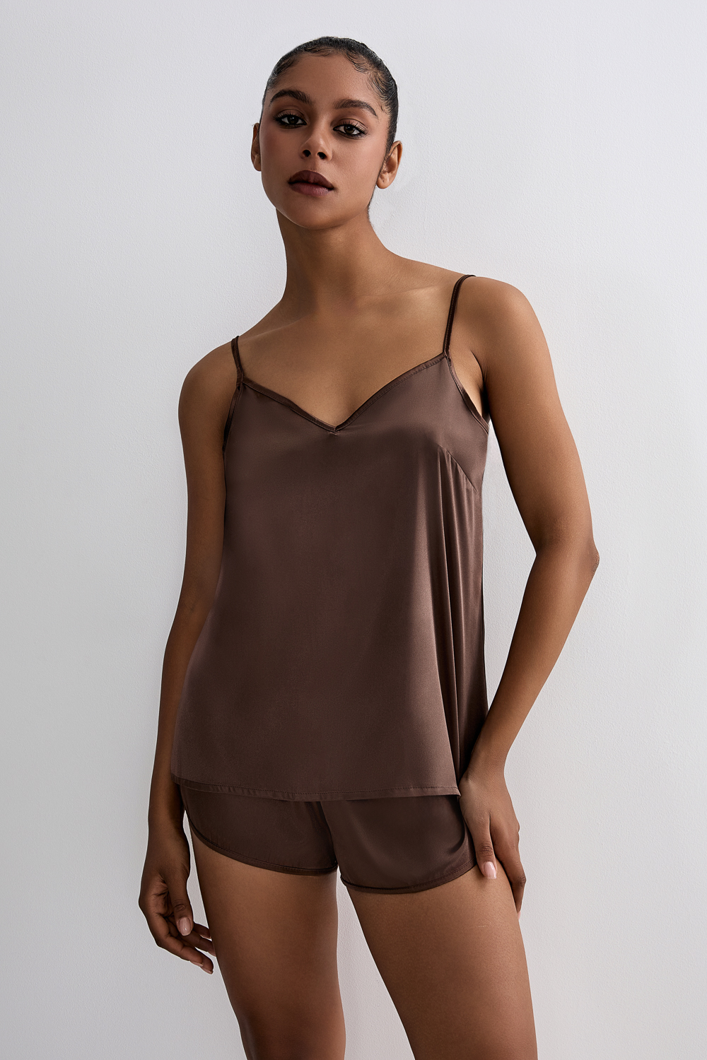 Комплект шорты и майка на бретелях из примиального атласа. Состав: 95%полиэстер 5%спандекс