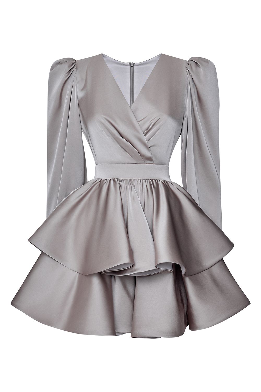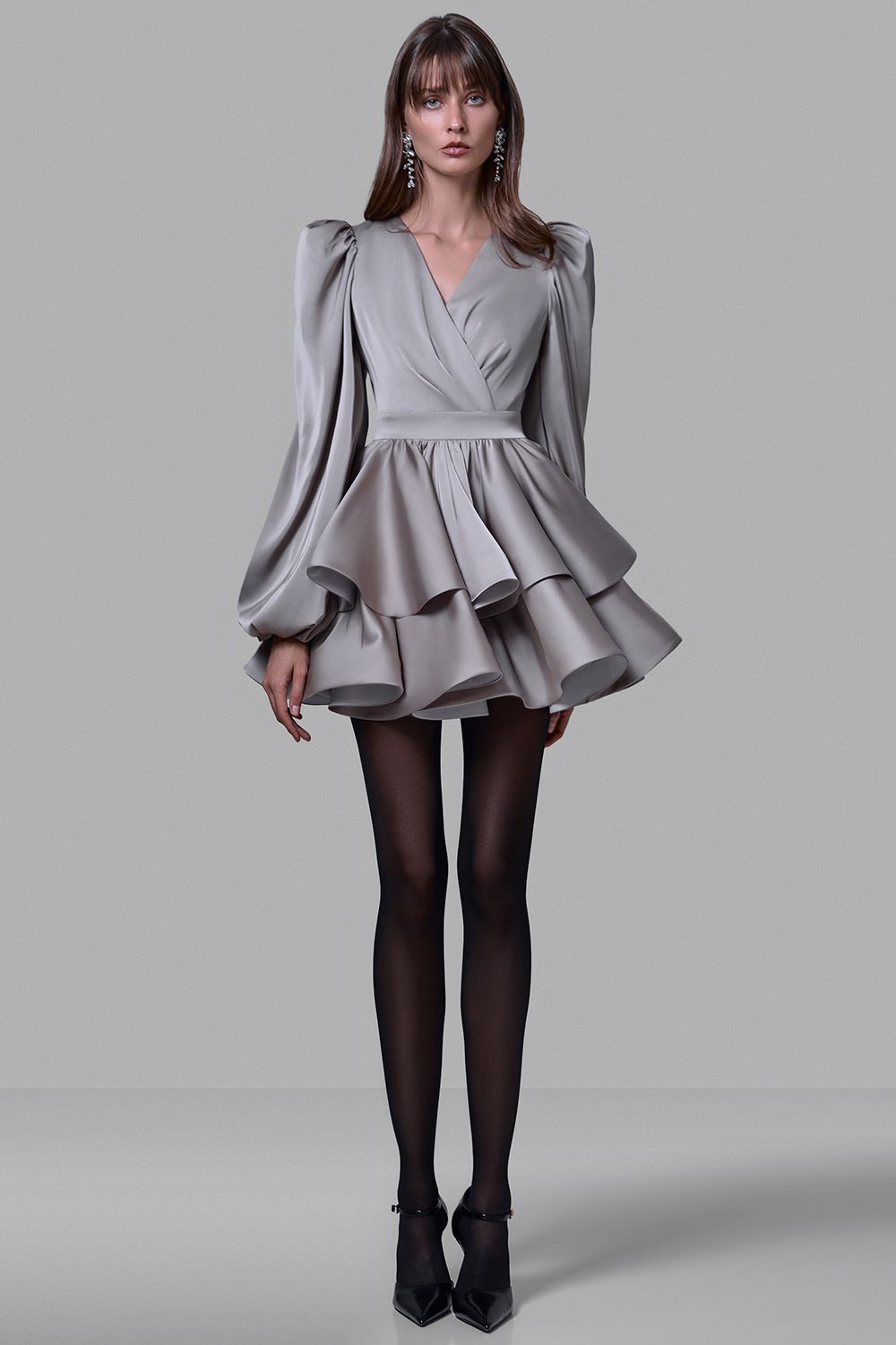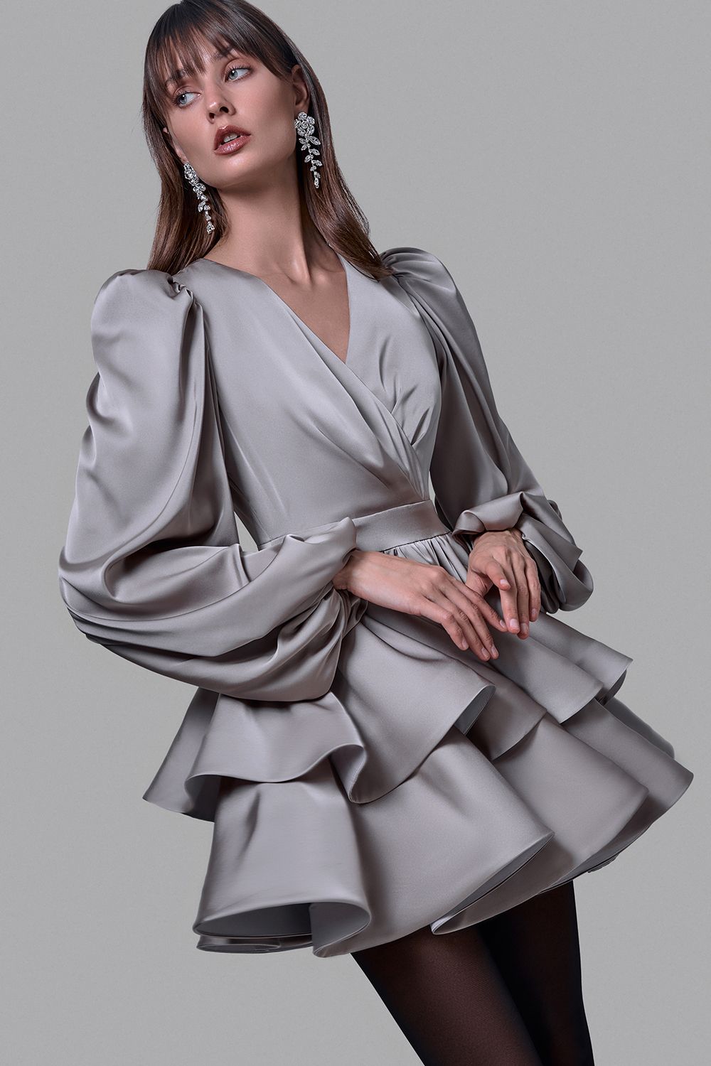 Эффектное платье мини с акцентом на плечи и воздушной многослойной юбкой. Модель выполнена с запахом и V-образным вырезом, подчеркивающим линию декольте. Длинные объемные рукава создают выразительный силуэт, а пышная юбка добавляет динамики образу. Идеальный выбор для вечеринки, коктейля или выхода в свет. Состав: 98% полиэстер, 2% спандекс, подкладка: 97% полиэстер, 3% эластан