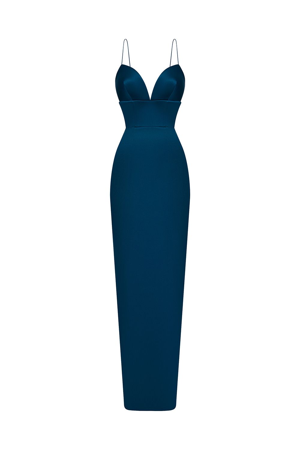 Элегантное платье-макси из плотного атласа с глубоким фигурным декольте. Тонкие бретели, приталенный силуэт, ровный удлинённый низ. Идеально для вечерних выходов и торжеств. Состав: 97% полиэстер, 3% спандекс, подкладка 95% полиэстер, 5% эластан