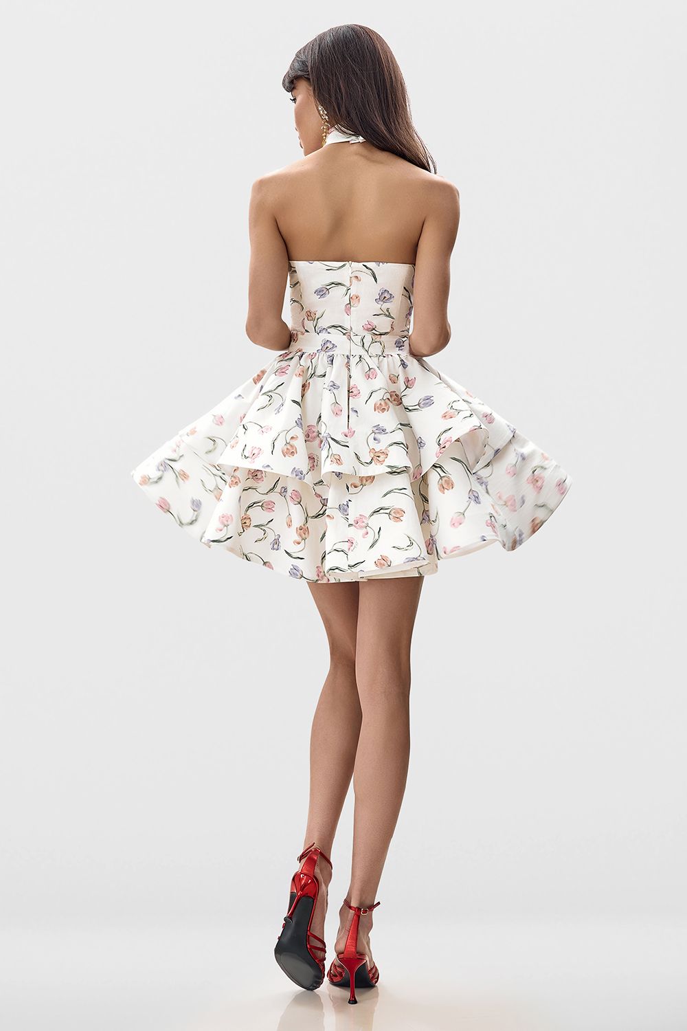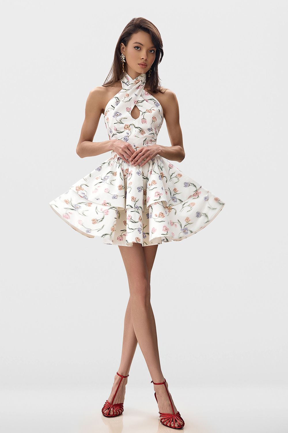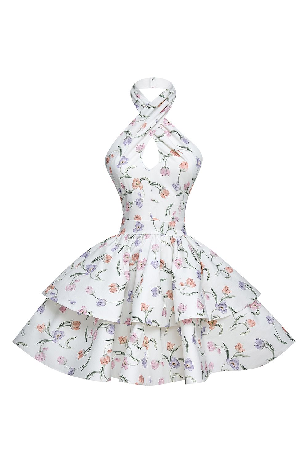 Легкое платье с эксклюзивным, цветочным принтом. Платье имеет свободный, летящий крой, благодаря двуслойной юбке, которая создает эффект многослойности и придает образу воздушности. Верхняя часть украшена изящным вырезом на горловине и завязкой на шее, обеспечивая элегантный и женственный образ. Длина по спинке: 54 см. (размер: S). Состав: 100% хлопок, Подкладка 100% хлопок