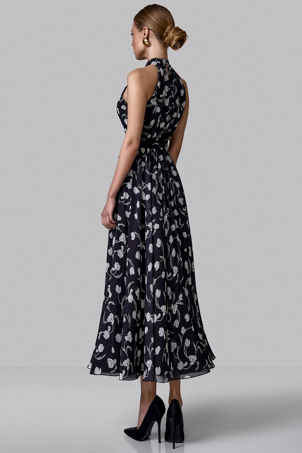 Воздушное платье миди, в котором сочетаются женственность и динамика движения. Верх с воротником-халтер изящно открывает плечи и подчеркивает линию шеи, создавая утонченный силуэт. Приталенная линия талии плавно переходит в расклешенную юбку, которая красиво раскрывается в движении. Цветочный принт добавляет образу свежести и романтичного настроения, делая модель универсальной для дневных выходов и особых случаев. Идеальное платье для летнего гардероба, отпусков и легких вечерних образов. Состав: 100% полиэстер, подкладка 97% полиэстер, 3% эластан