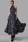 Воздушное платье миди, в котором сочетаются женственность и динамика движения. Верх с воротником-халтер изящно открывает плечи и подчеркивает линию шеи, создавая утонченный силуэт. Приталенная линия талии плавно переходит в расклешенную юбку, которая красиво раскрывается в движении. Цветочный принт добавляет образу свежести и романтичного настроения, делая модель универсальной для дневных выходов и особых случаев. Идеальное платье для летнего гардероба, отпусков и легких вечерних образов. Состав: 100% полиэстер, подкладка 97% полиэстер, 3% эластан