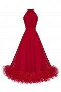 Эффектное платье-халтер с летящим силуэтом и роскошной перьевой отделкой по подолу и манжетам. Модель подчёркивает талию, мягко струится при движении и создаёт яркий, запоминающийся вечерний образ. Идеально для торжеств, съёмок и выходов, где хочется максимального вау-эффекта. Состав: 100% полиэстер, подкладка 97% полиэстер, 3% эластан