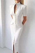 Лаконичное платье-футляр миди длины с приталенным силуэтом. Вертикальная декоративная планка с оригинальными пуговицами формирует вытянутый и собранный образ. Воротник-стойка и короткий рукав добавляют строгости и современной архитектурности. Универсальный вариант для делового и вечернего гардероба. Состав: 72% полиэстер, 23% вискоза, 5% эластан, Подклад 95% полиэстер, 5% эластан