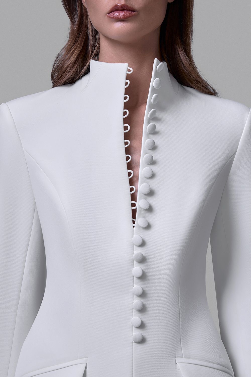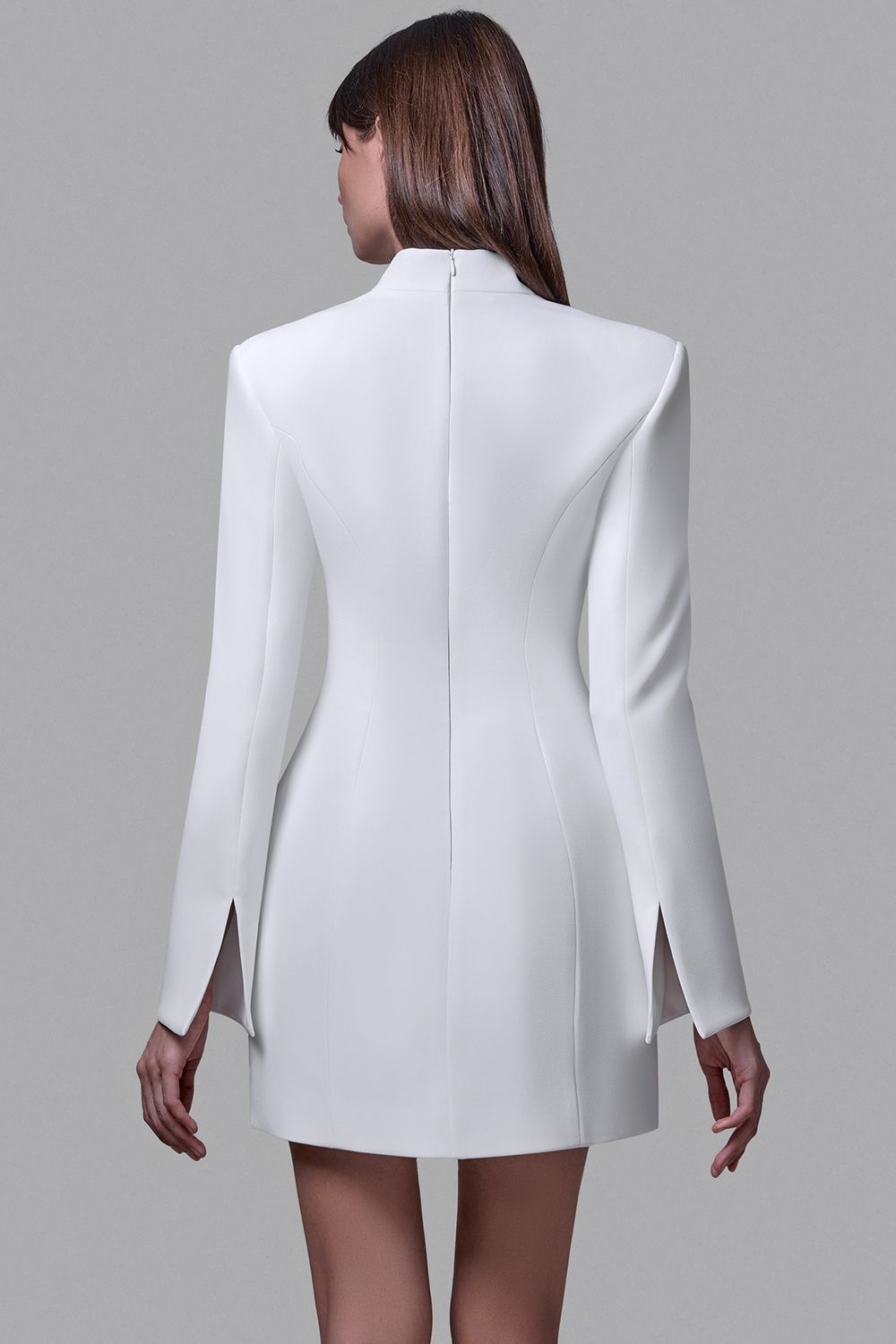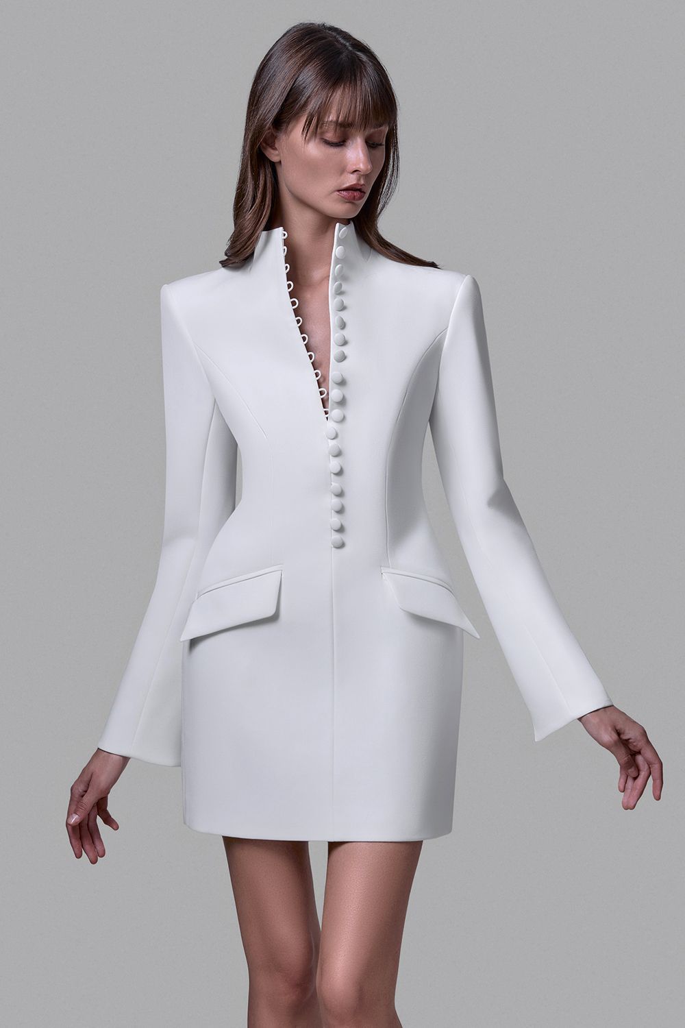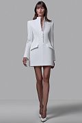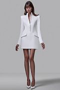 Элегантное мини-платье строгого кроя с длинным рукавом. Модель выполнена в стиле жакета с выразительными плечами, приталенным силуэтом и имитацией клапанов карманов. Визуальный акцент — глубокий V-образный вырез с оригинальной застежкой на ряд обтянутых пуговиц. Идеальный выбор для вечернего выхода или стильного коктейльного образа. Длина платья: 80,5 (размер: S). Состав: 71% полиэстер, 23% вискоза, 6% эластан, Подклад 95% полиэстер 5% эластан