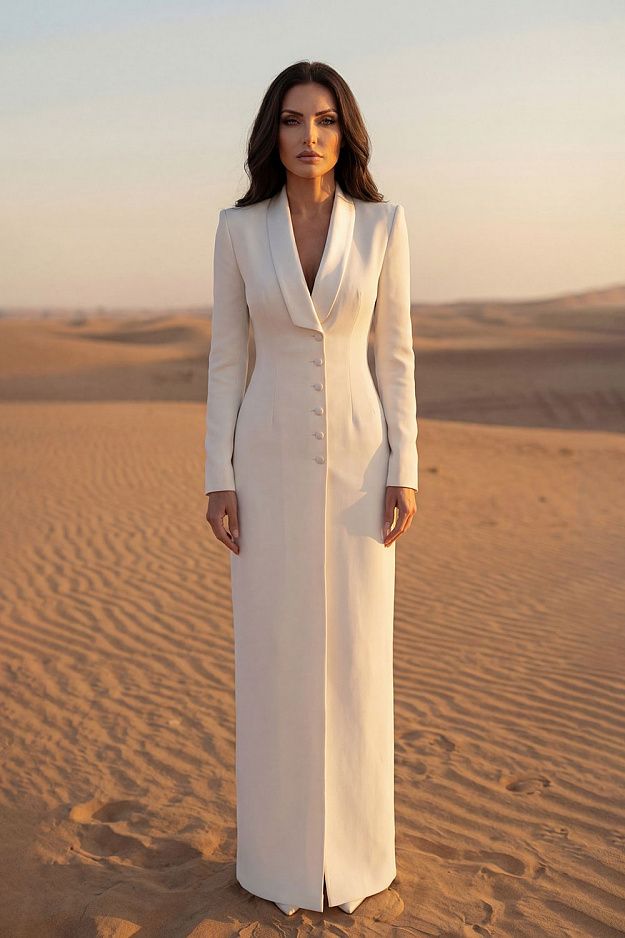 Элегантное платье-смокинг, идеальный выбор для торжественных выходов и особых событий. Модель подчёркивает силуэт благодаря безупречному крою: акцентированная линия плеч, глубокий V-вырез с мягко скульптурированным лацканом и утончённый приталенный корпус формируют изящную «песочную» фигуру. Длина по спинке: 152 см. Состав: 67% полиэстер, 29% вискоза, 4% эластан; подкладка: 95% полиэстер, 5% эластан