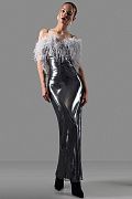 Платье-комбинация макси из металлизированной ткани. Верх украшен объемным декором из перьев - они создают воздушное облако вокруг линии декольте и делают образ особенно выразительным. Спинка открытая, с тонкими бретелями, которые регулируются по длине. За счёт плотного, но пластичного материала платье идеально подчеркивает силуэт. Состав: 100% полиэстер, подкладка 97% полиэстер, 3% эластан