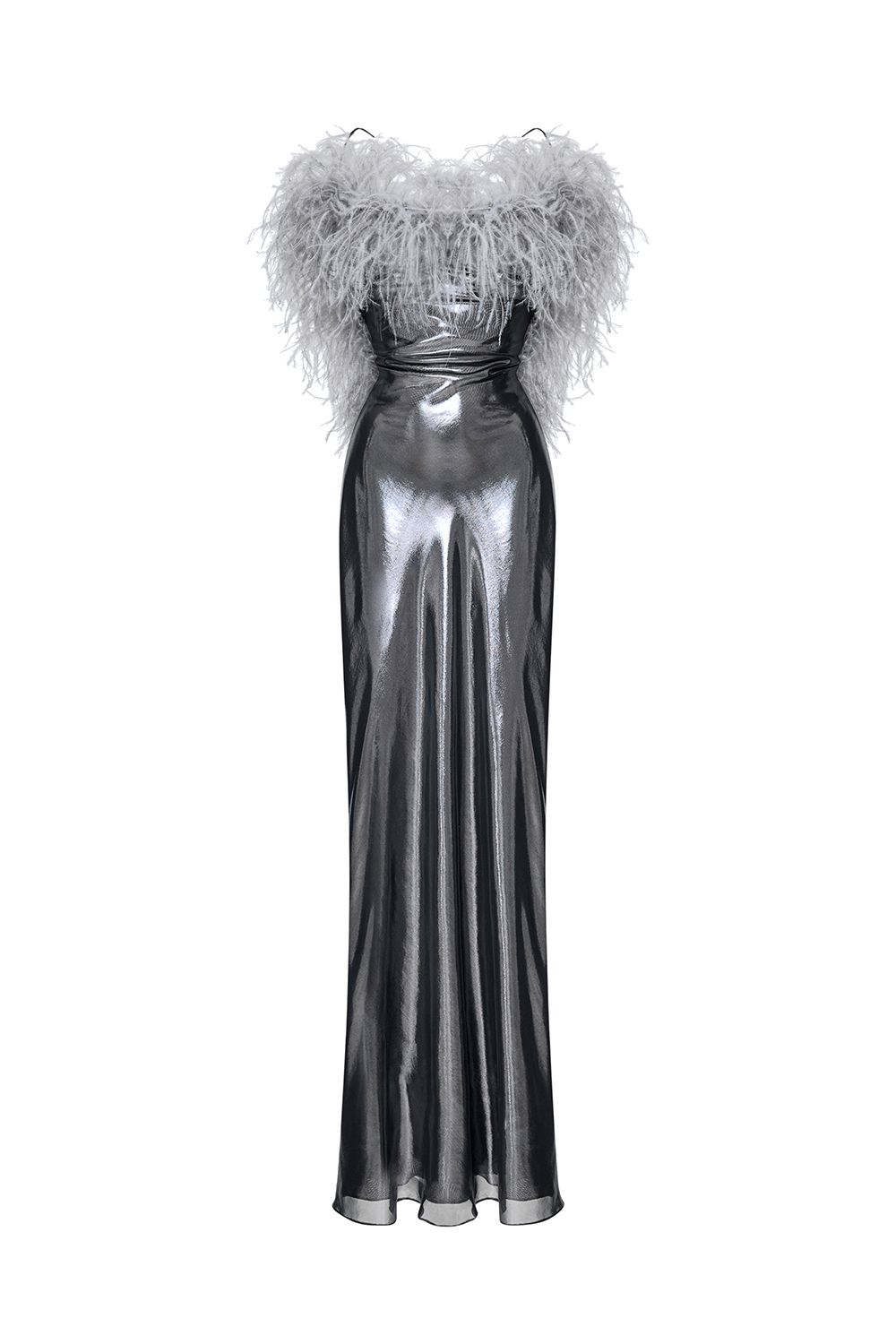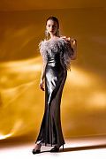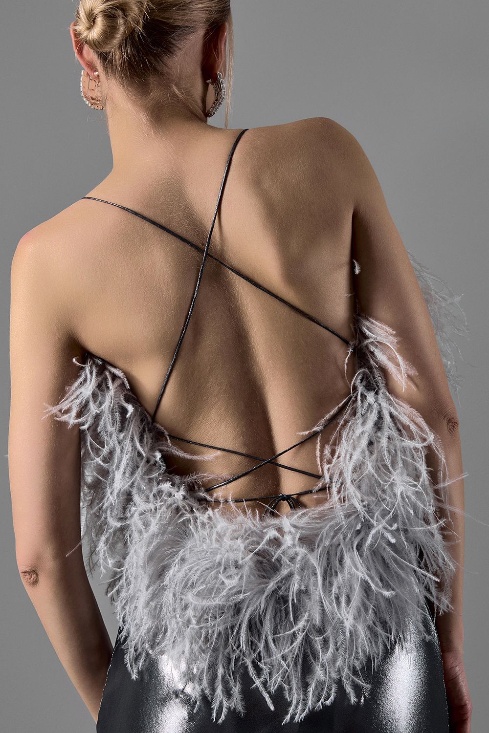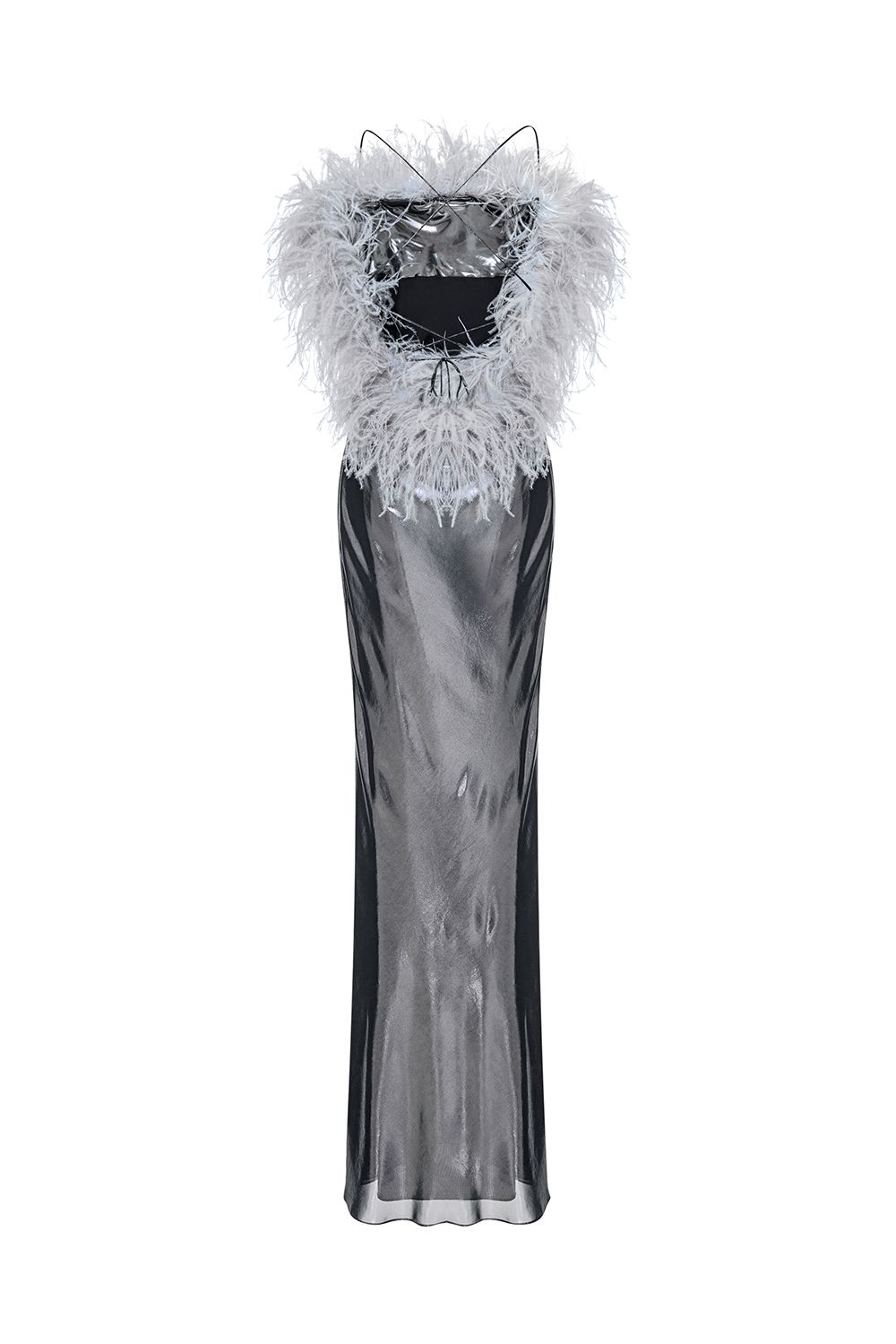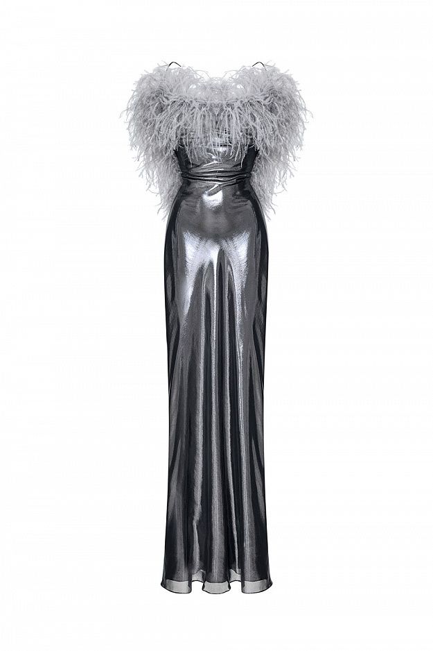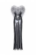 Платье-комбинация макси из металлизированной ткани. Верх украшен объемным декором из перьев - они создают воздушное облако вокруг линии декольте и делают образ особенно выразительным. Спинка открытая, с тонкими бретелями, которые регулируются по длине. За счёт плотного, но пластичного материала платье идеально подчеркивает силуэт. Состав: 100% полиэстер, подкладка 97% полиэстер, 3% эластан