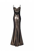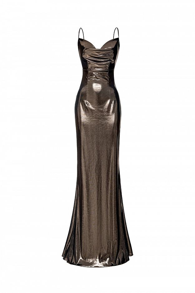 Модель с мягким драпированным лифом и тонкими бретелями, которые эффектно перекрещиваются на спине и регулируются завязками. Акцент на открытой спине и приталенном силуэте, плавно переходящем в расклёшенный подол. Ткань с глянцевым блеском подчеркивает каждое движение и создаёт лёгкое свечение при любом освещении. Идеальный выбор для вечернего выхода, коктейльной вечеринки или торжественного события. Состав: 67% полиэстер, 30% вискоза, 3% эластан; подкладка 100% нейлон
