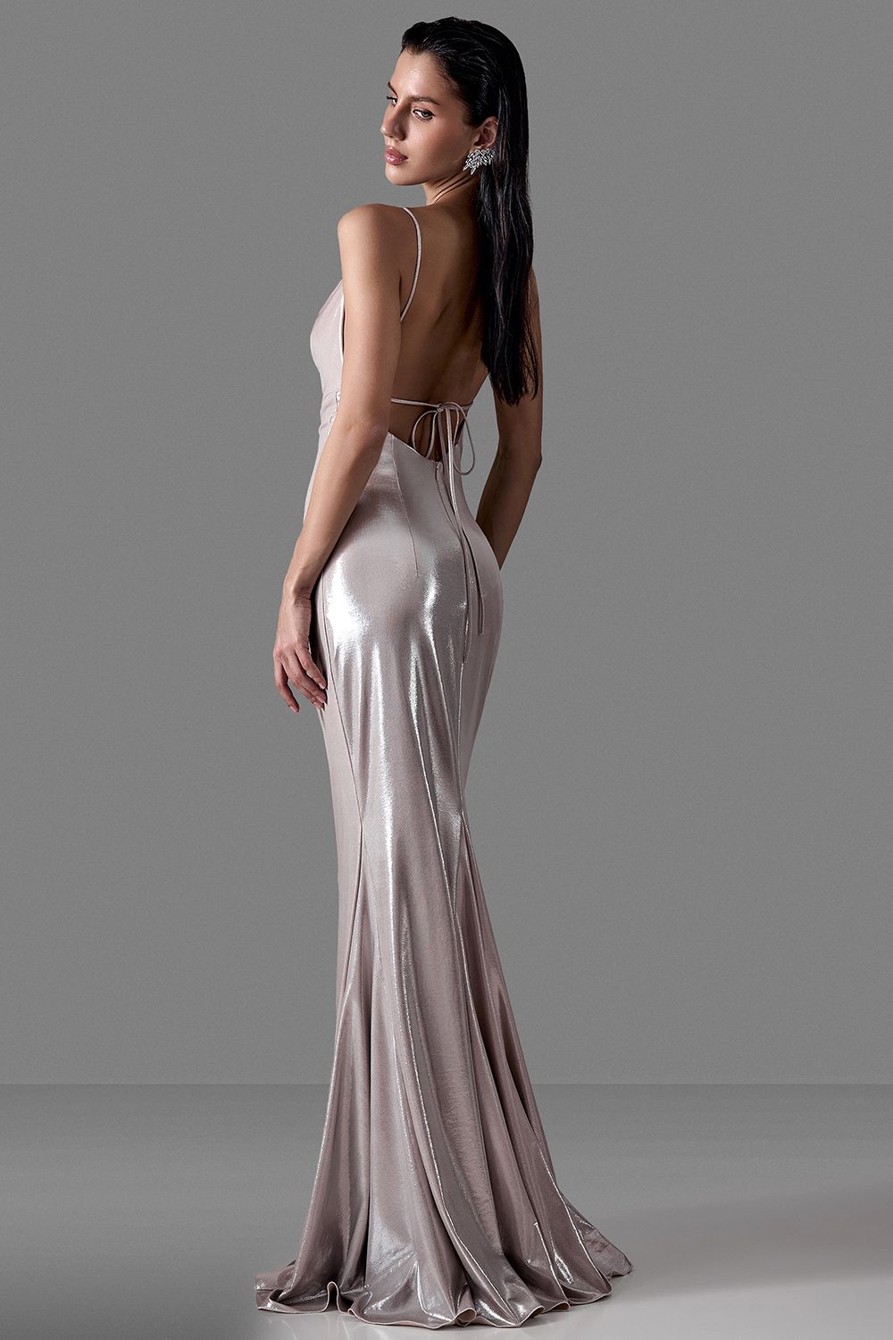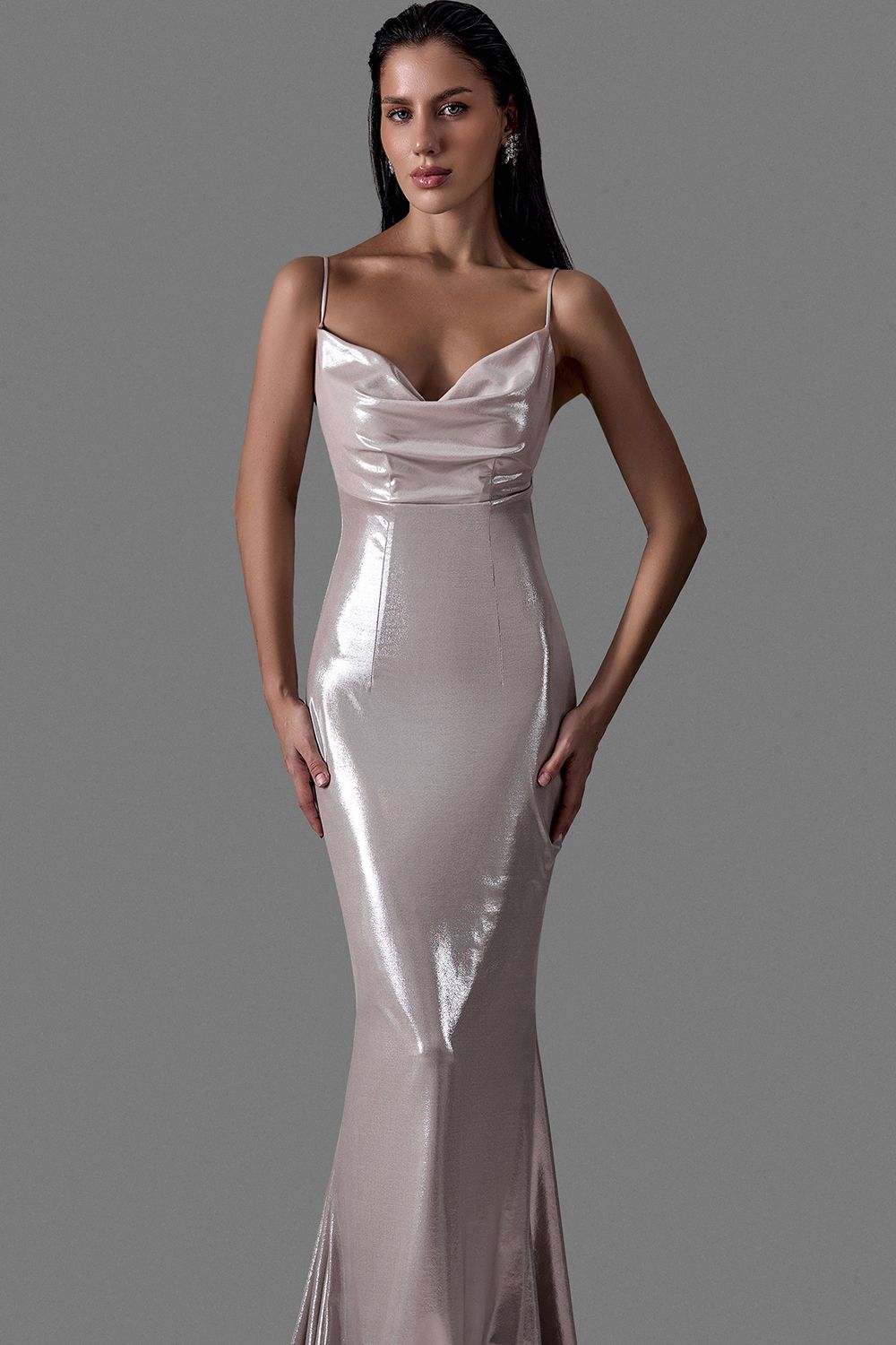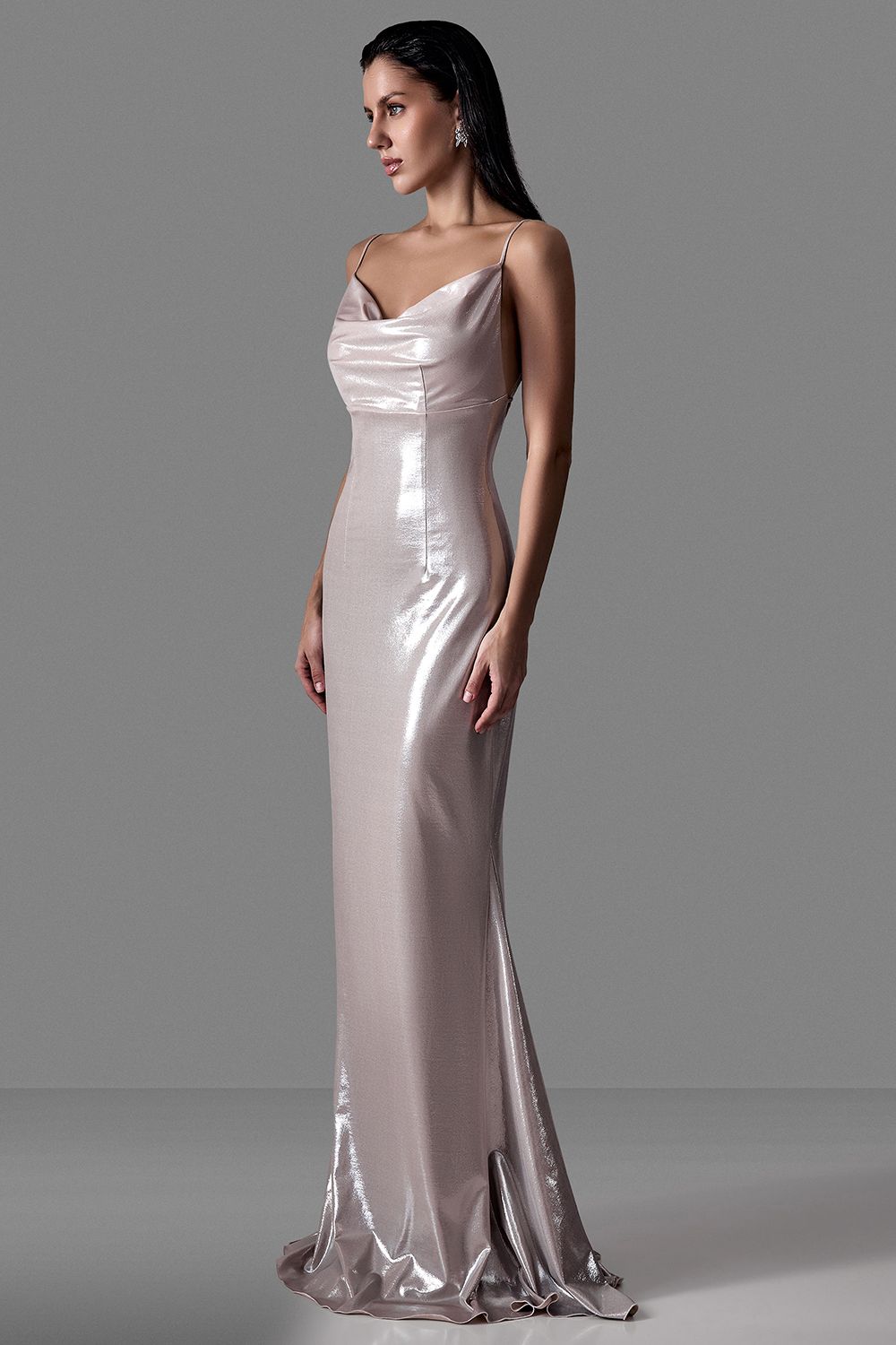 Модель с мягким драпированным лифом и тонкими бретелями, которые эффектно перекрещиваются на спине и регулируются завязками. Акцент на открытой спине и приталенном силуэте, плавно переходящем в расклёшенный подол. Ткань с глянцевым блеском подчеркивает каждое движение и создаёт лёгкое свечение при любом освещении. Идеальный выбор для вечернего выхода, коктейльной вечеринки или торжественного события. Состав: 67% полиэстер, 30% вискоза, 3% эластан; подкладка 100% нейлон