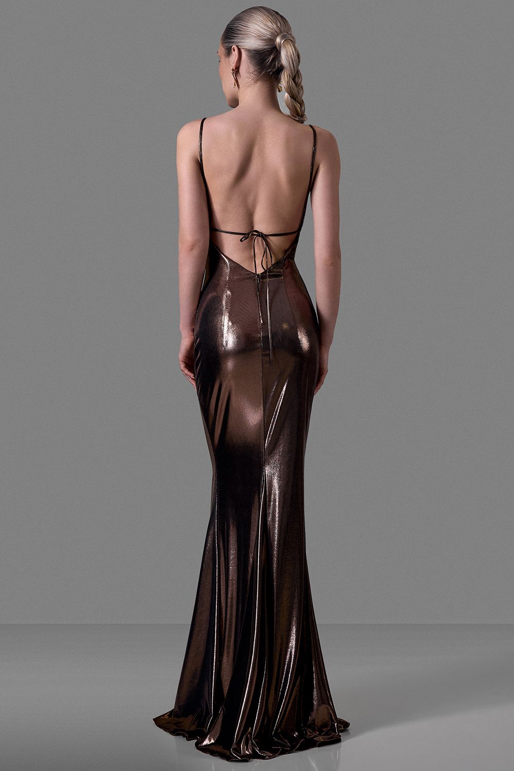 Модель с мягким драпированным лифом и тонкими бретелями, которые эффектно перекрещиваются на спине и регулируются завязками. Акцент на открытой спине и приталенном силуэте, плавно переходящем в расклёшенный подол. Ткань с глянцевым блеском подчеркивает каждое движение и создаёт лёгкое свечение при любом освещении. Идеальный выбор для вечернего выхода, коктейльной вечеринки или торжественного события. Состав: 67% полиэстер, 30% вискоза, 3% эластан; подкладка 100% нейлон
