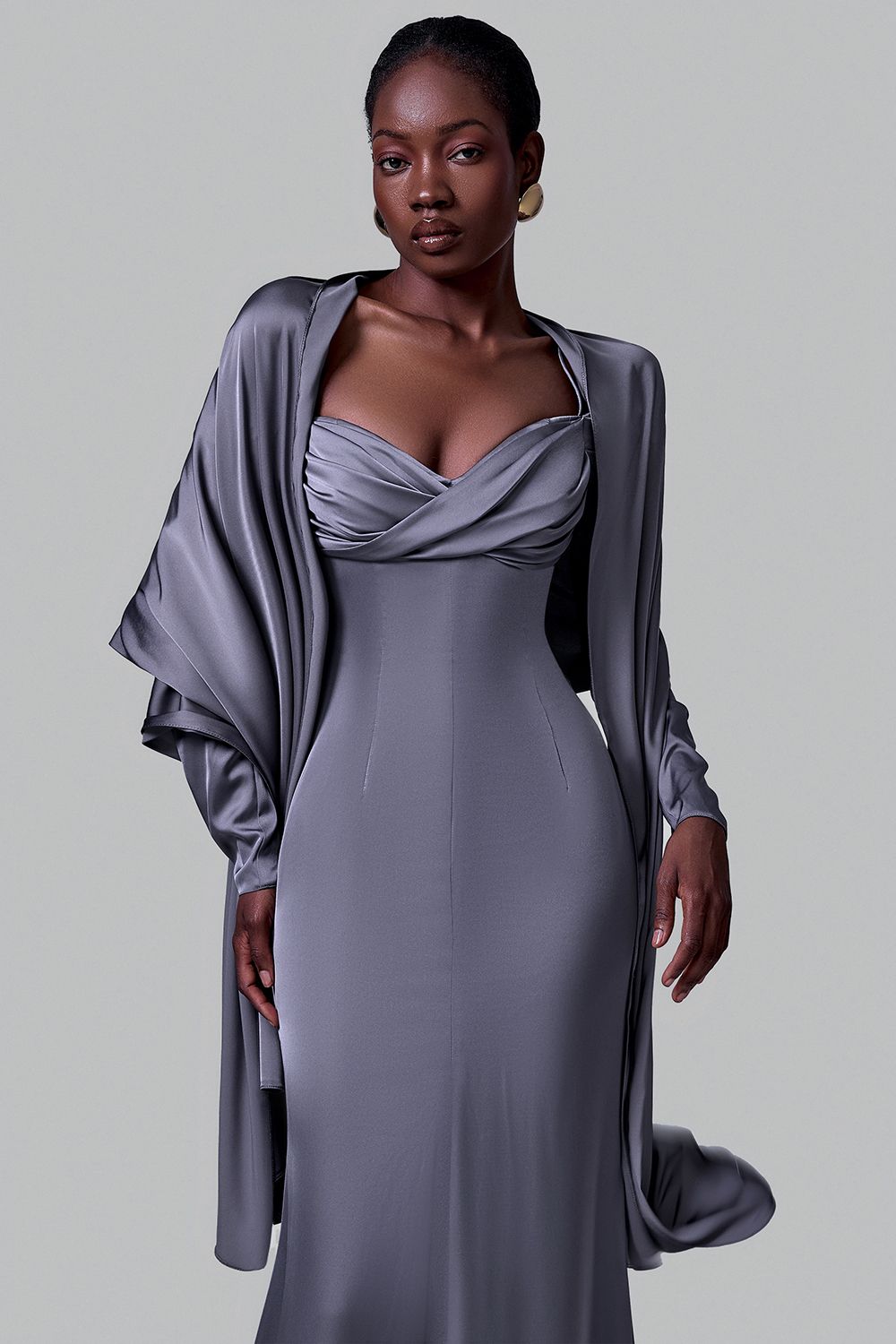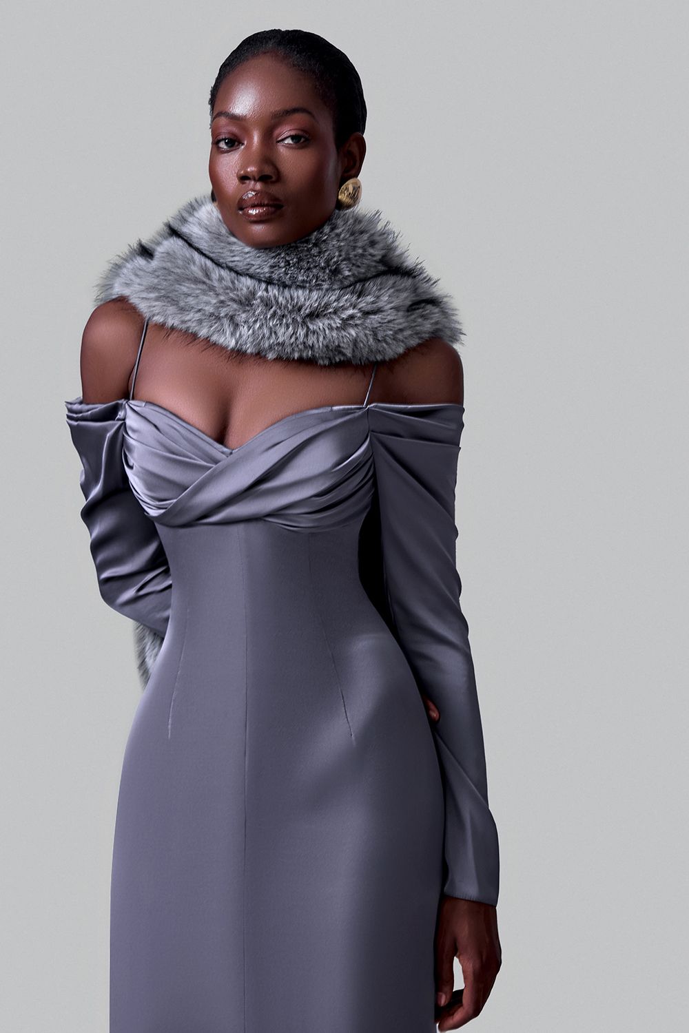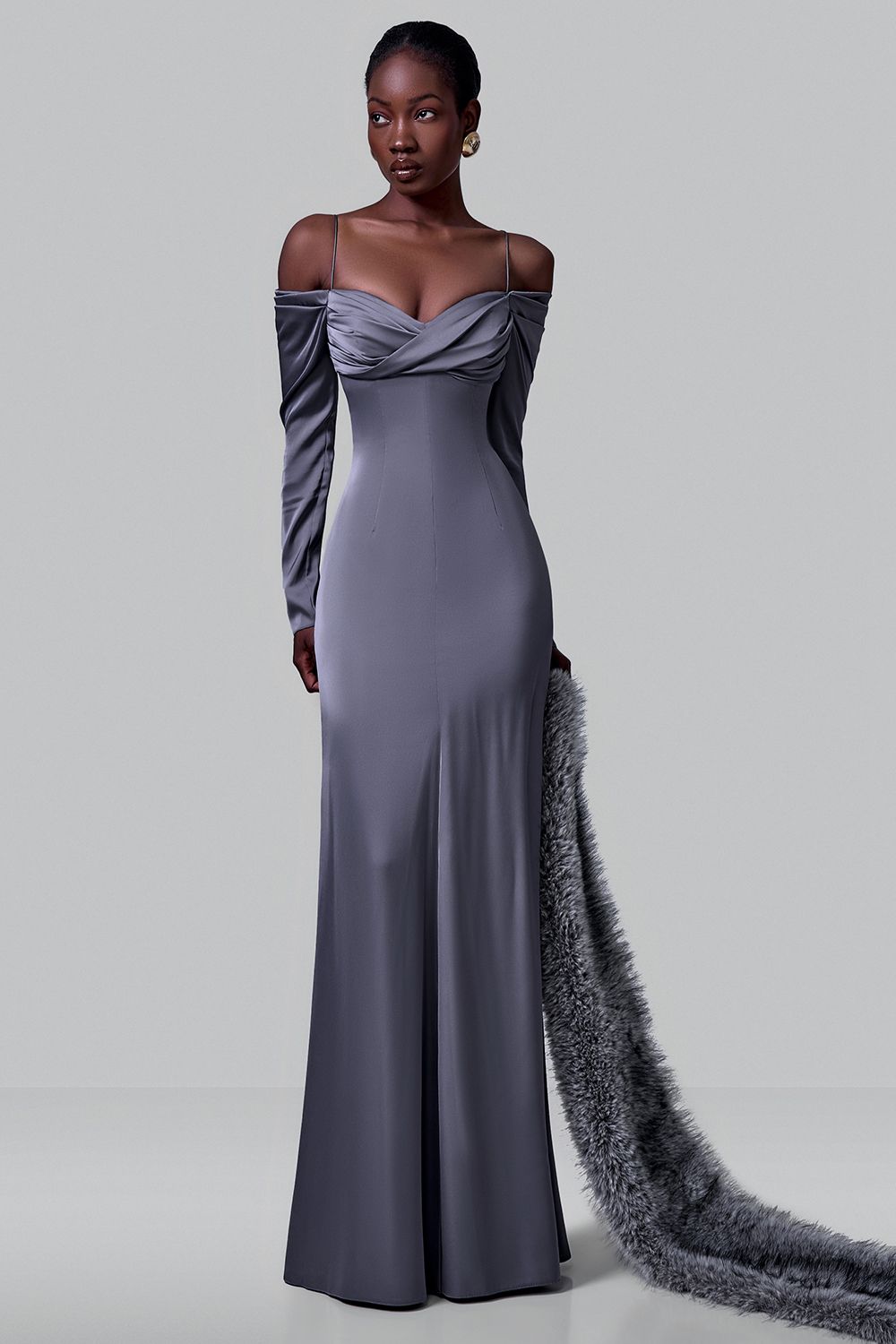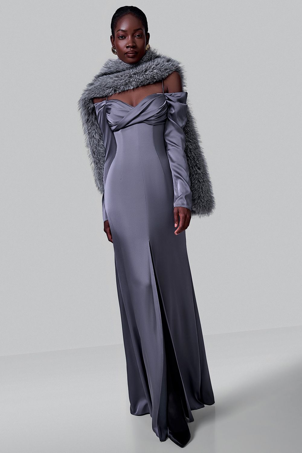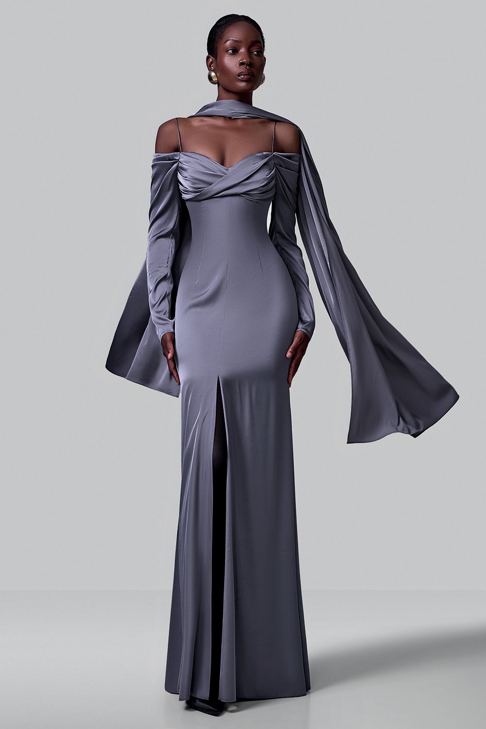 Элегантное платье в пол с открытыми плечами и длинными рукавами. Классический приталенный крой с акцентом на стройный силуэт и высоким разрезом спереди. Мягкая ткань с легким блеском изысканно драпируется и подчеркивает фигуру. Идеально сочетается с палантином из той же ткани, который продается отдельно (арт. 98128). Основная ткань: 97% полиэстер, 3% спандекс Подкладка: 97% полиэстер, 3% эластан